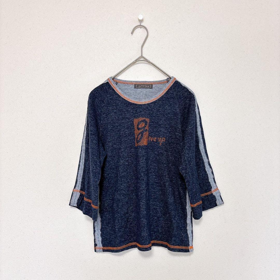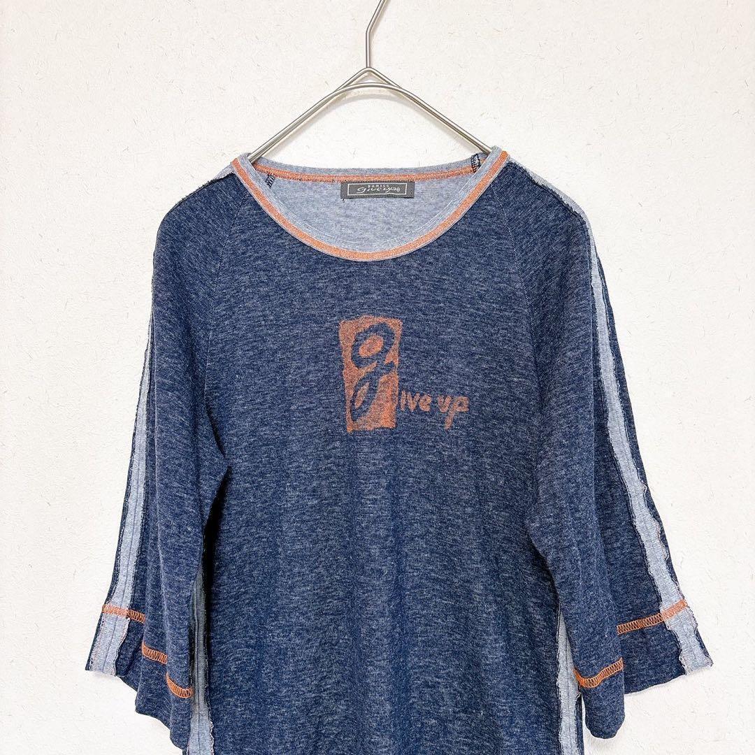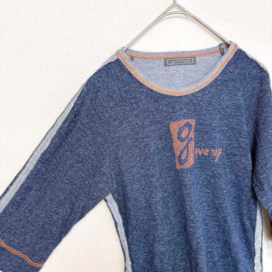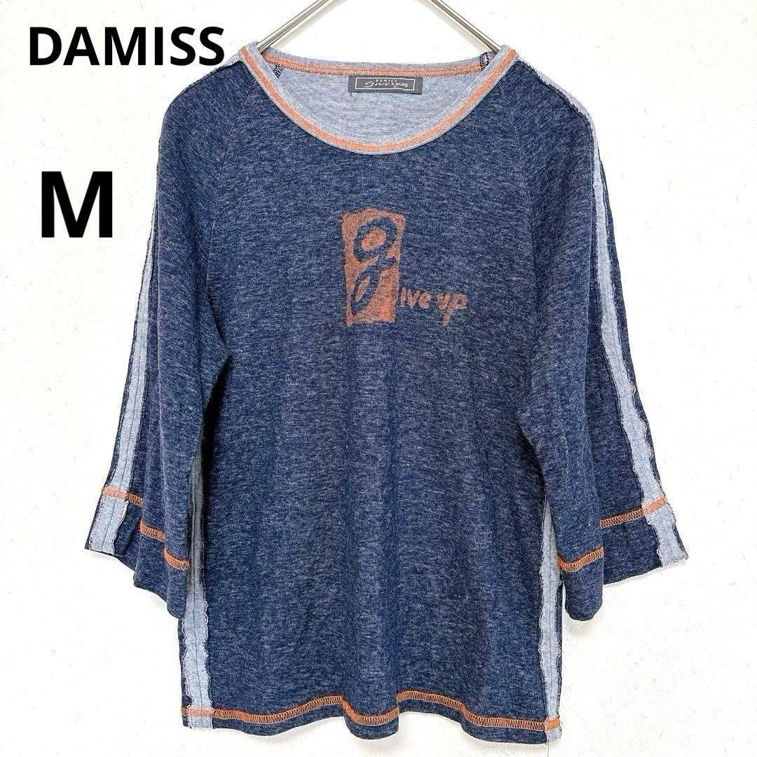 DAMISS 七分袖カットソー M ネイビー デニム風ゆったりロゴ入り 1CF6A9