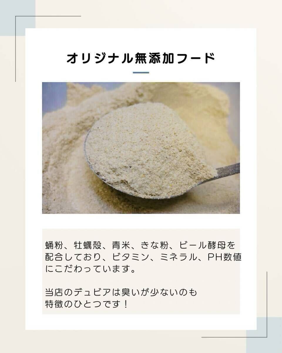 蛹粉、牡蠣殻、青米、きな粉、ビール酵母を配合しており、ビタミン、ミネラル、PH数値にこだわっています。