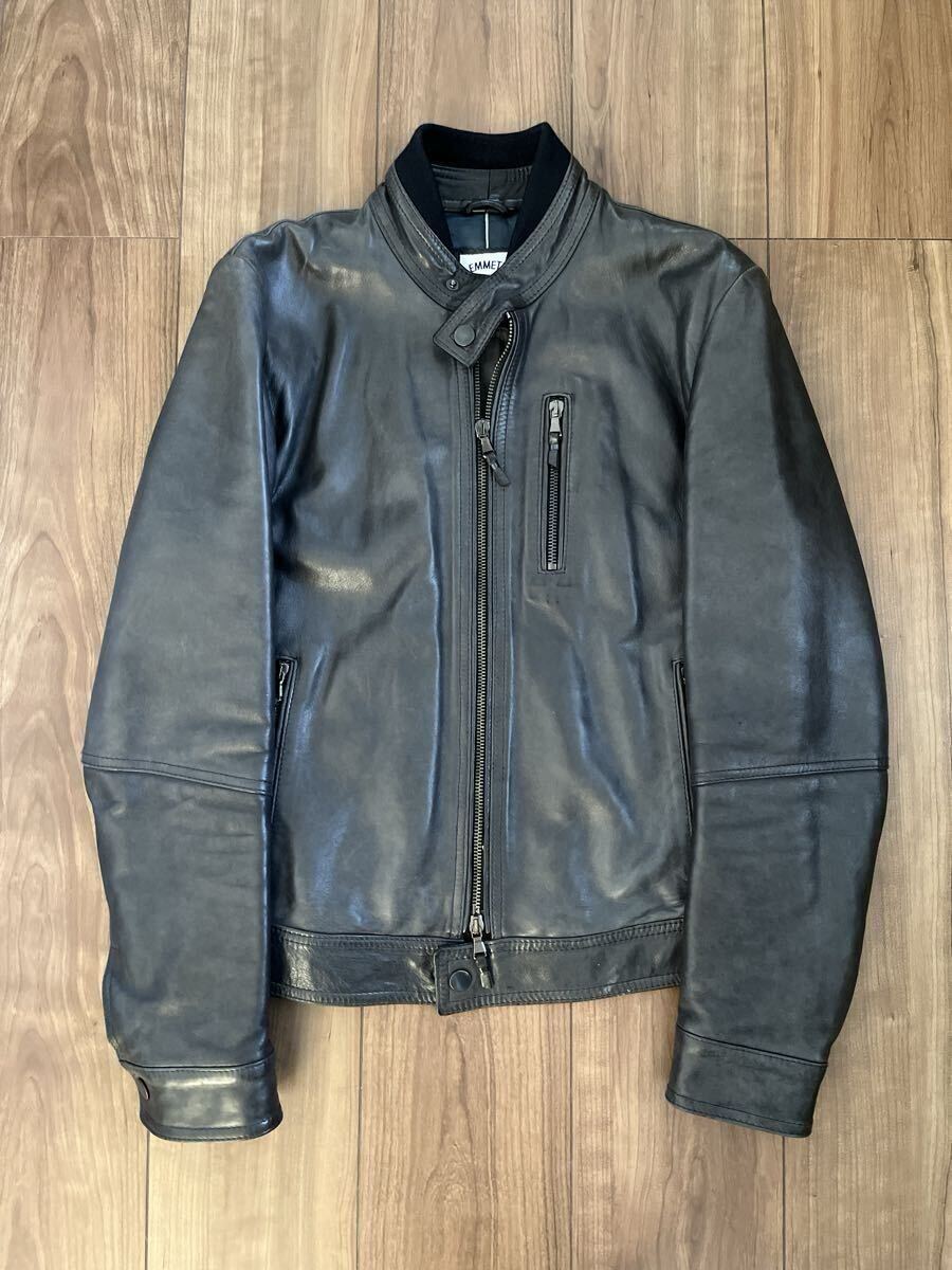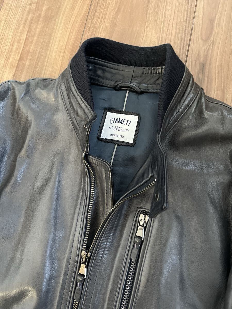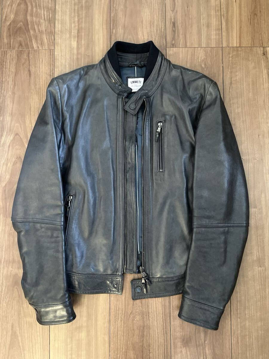数年前に都内のBEAMSで購入しました、別注のエンメティのレザーシングルライダースになります。定価は14万円程でした。状態は全体的に若干の色褪せやシワなどありますが、いい感じにこなれ感は出ています。内側の背中部分の生地に一部ほつれがあります。素材はラムレザーです。厚手のしっかりとしたレザーなので秋冬向けです。色はブラック(写真参考)、サイズは44で、肩幅43cm、身幅48cm、着丈58cm、袖丈61cmです。参考までに168cm、57kgの私が着ていてちょうど良いサイズ感です。