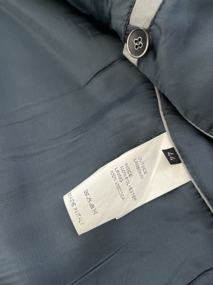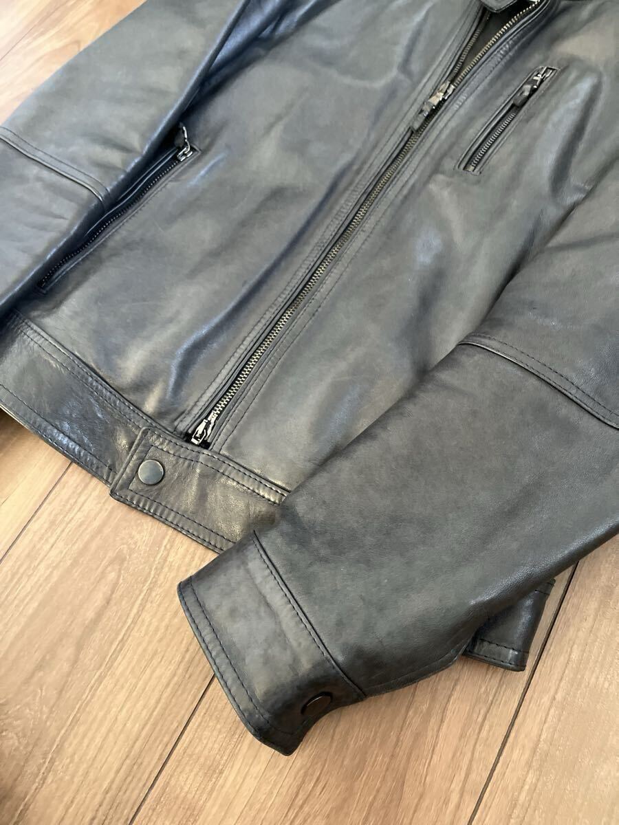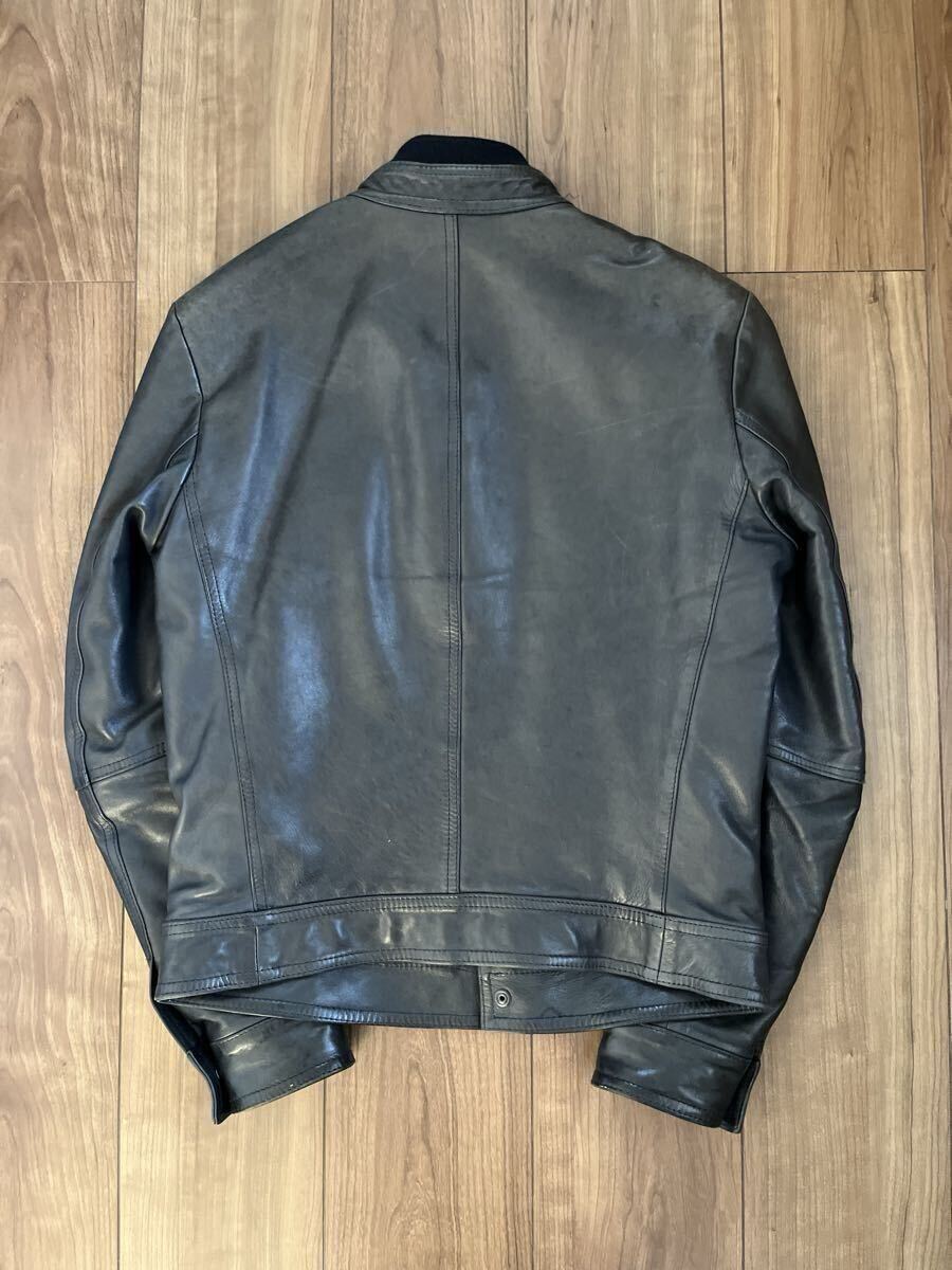 数年前に都内のBEAMSで購入しました、別注のエンメティのレザーシングルライダースになります。定価は14万円程でした。状態は全体的に若干の色褪せやシワなどありますが、いい感じにこなれ感は出ています。内側の背中部分の生地に一部ほつれがあります。素材はラムレザーです。厚手のしっかりとしたレザーなので秋冬向けです。色はブラック(写真参考)、サイズは44で、肩幅43cm、身幅48cm、着丈58cm、袖丈61cmです。参考までに168cm、57kgの私が着ていてちょうど良いサイズ感です。