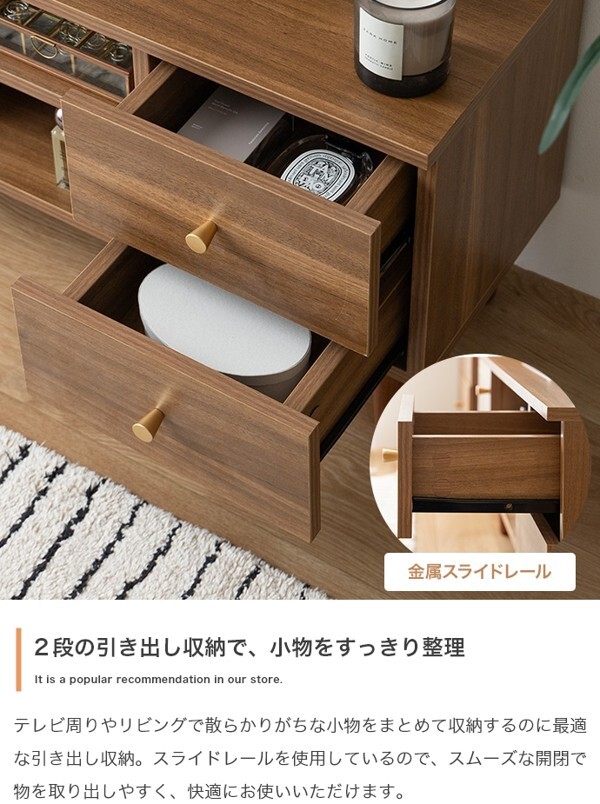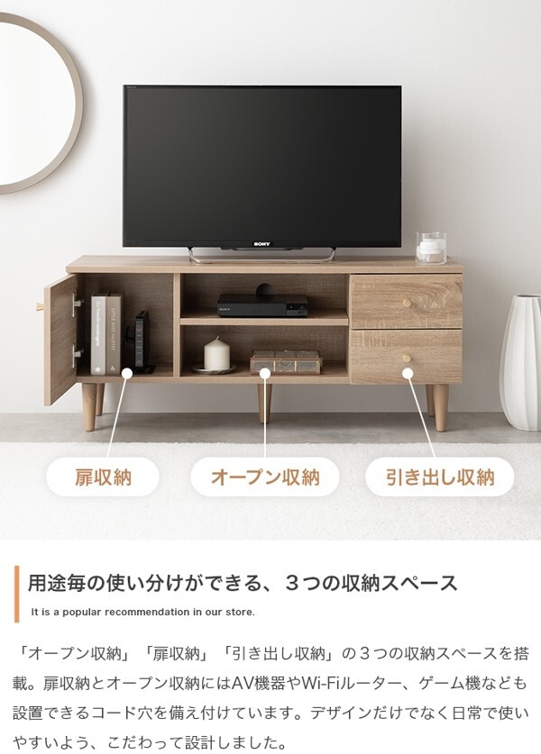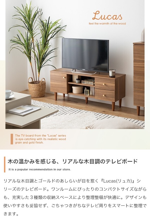※現在ご覧の商品ページはナチュラルのご購入ページとなります。 ヤフオクの仕様上単一ページに複数バリエーションを掲載することができませんので、他バリエーションが希望の場合は別ページでご購入お願い致します。 木の温かみを感じるリアルな木目調とゴールドのあしらいが目を惹く『Lucas(リュカ)』シリーズのテレビボード。 ワンルームにぴったりのコンパクトサイズながらも充実した3種類の収納スペースにより整理整頓が快適に。 背面にはコード穴のほか、配線を逃がすコードスリットやタップ収納を設置。 壁にぴったりくっつけられ、すっきり置けるようにこだわりました。 デザインも使いやすさも妥協せず、ごちゃつきがちなテレビ周りをスマートに整理できます。 配達業者を指定いただくことはできません。 沖縄・離島に関しましては、別途配送料が必要となります。 北海道への配送も別途配送料が必要になる場合がございます。 ※別途送料が発生する場合は後ほどご連絡させていただきます。 タイミングによっては在庫切れの場合があります。