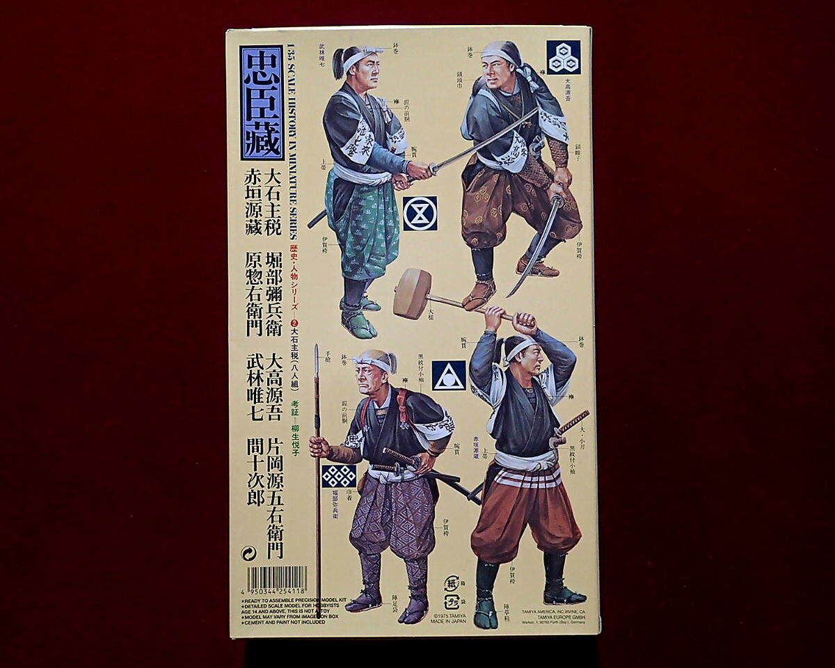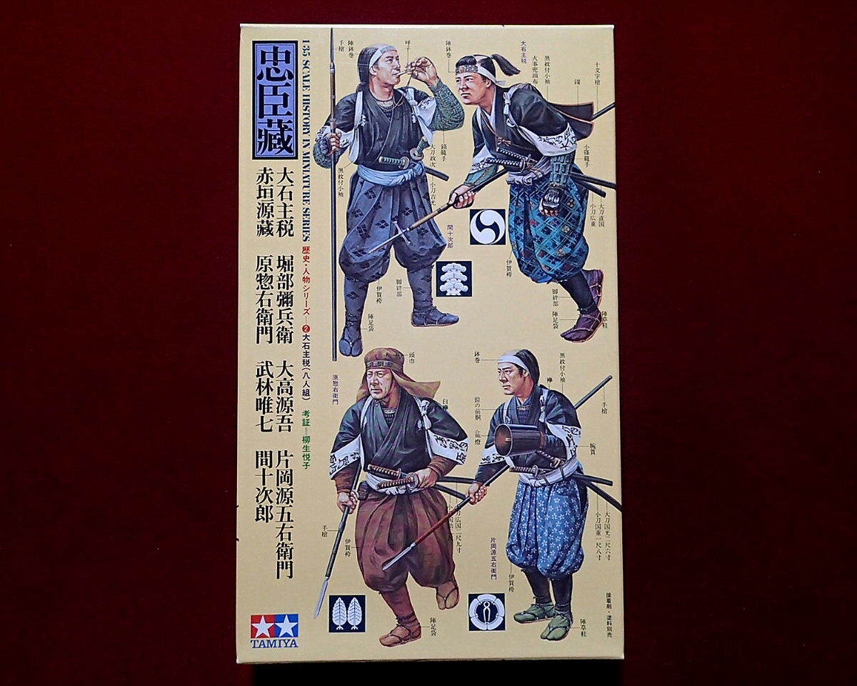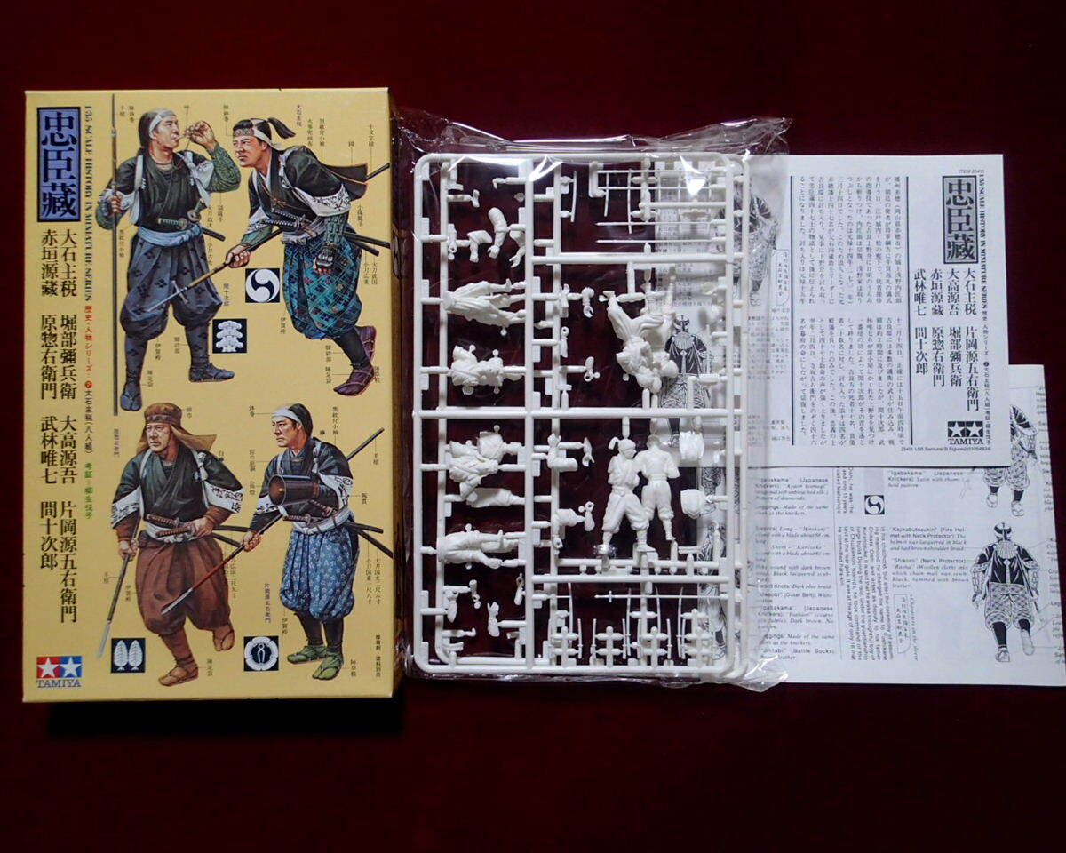 ●忠臣蔵から、赤穂義士・討ち入り姿の大石主税、堀部弥兵衛、大高源吾、片岡源五右衛門、赤垣源蔵、原惣右衛門、武林唯七、間十次郎の8体がセットされています。衣装、武器等も史実に基づき忠実にモデル化されています。現在手に入り難い希少キットです。