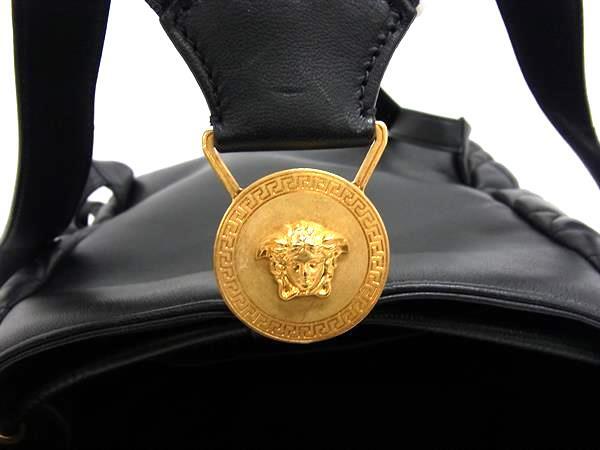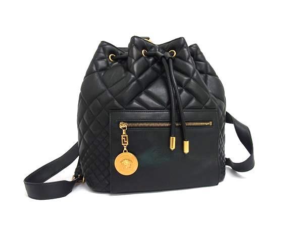 1円 VERSACE ヴェルサーチ メデューサ レザー 巾着型 リュックサック バックパック デイパック レディース ブラック系 FN8546