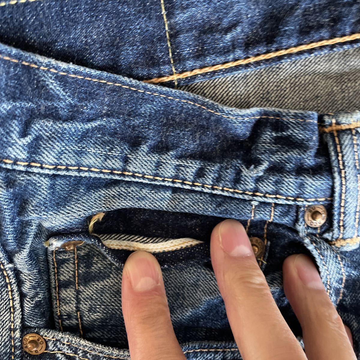 バックポケットは、いわゆるアーキュエイトステッチがスリ切れた状態を再現してます。トップボタンはブロンズで、ジッパーはGRIPPERです。