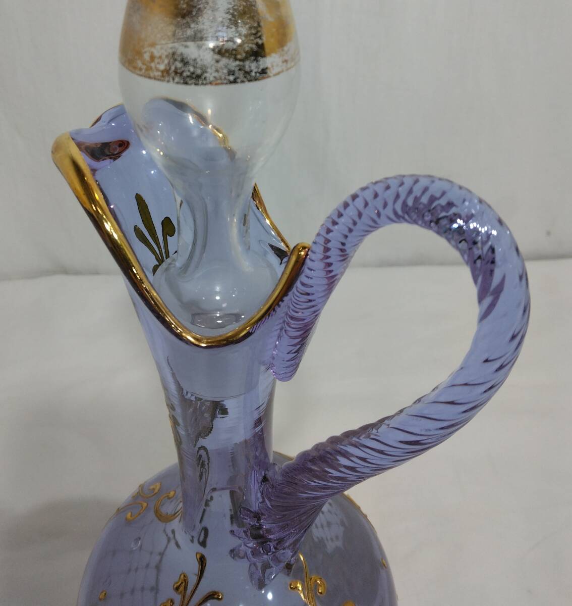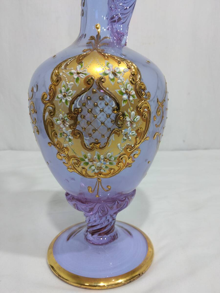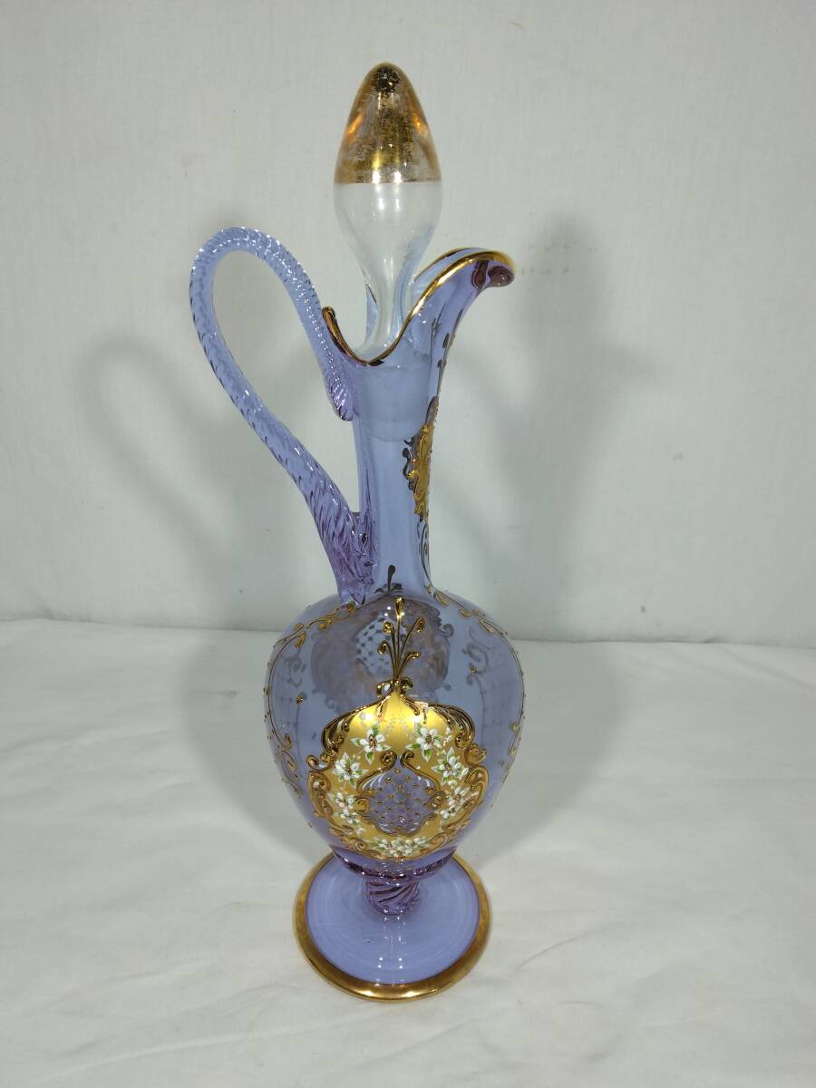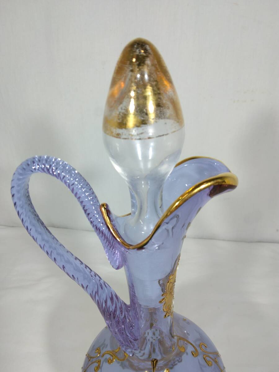 □1円 ベネチアン グラス 水差し 蓋つき 水色 金彩 花柄入 イタリアガラス工芸品 USED品 アンティーク 割れ欠けヒビなし 金彩のがれ有