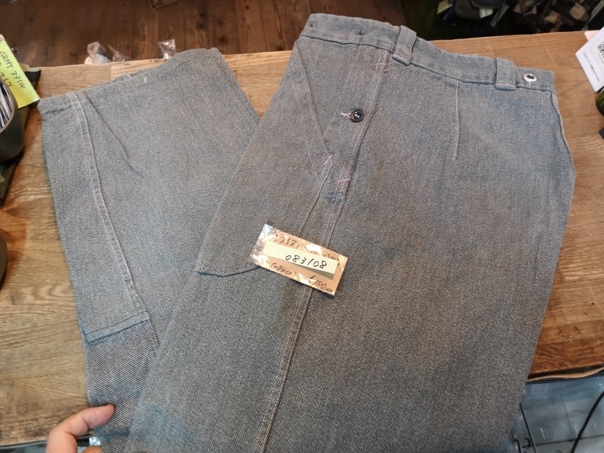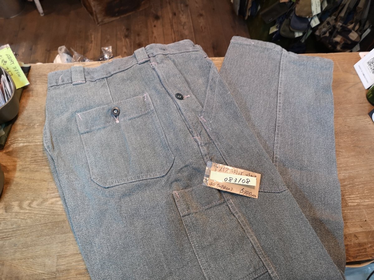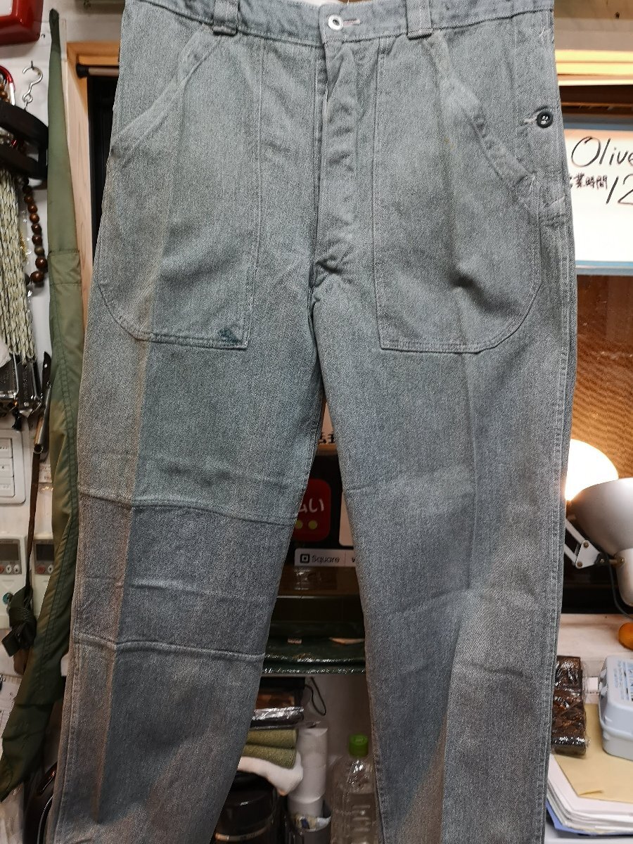スイス軍放出のアンティークデニム素材のワークパンツの貴重なアルミボタン仕様(3個プラボタンです、内側にサスペンダー用が4個ありますから気になるい方は交換してください)。 全体的には若干の色落ち感ありな感じで、補修は左ひざ部分の生地交換とポケット部分に小さめの物あり。 サスペンダー用のボタンもついています! ポケットは通常の左右のポケットと 左右のスルーポケットで 使い分け出来て便利、 後ろポケットは右側に1個。 フライはボタン留め。実にいい感じの味のパンツに仕上がってます。 サイズ表示50はウエスト94cm、全長109cm、股下76cm 、太もも幅36cm程度。 沖縄離島を除く全国元払い500円でお送りいたします。落札価格にプラスでお願いします。