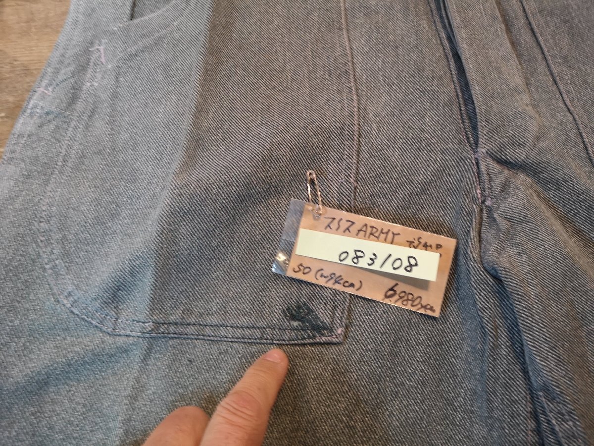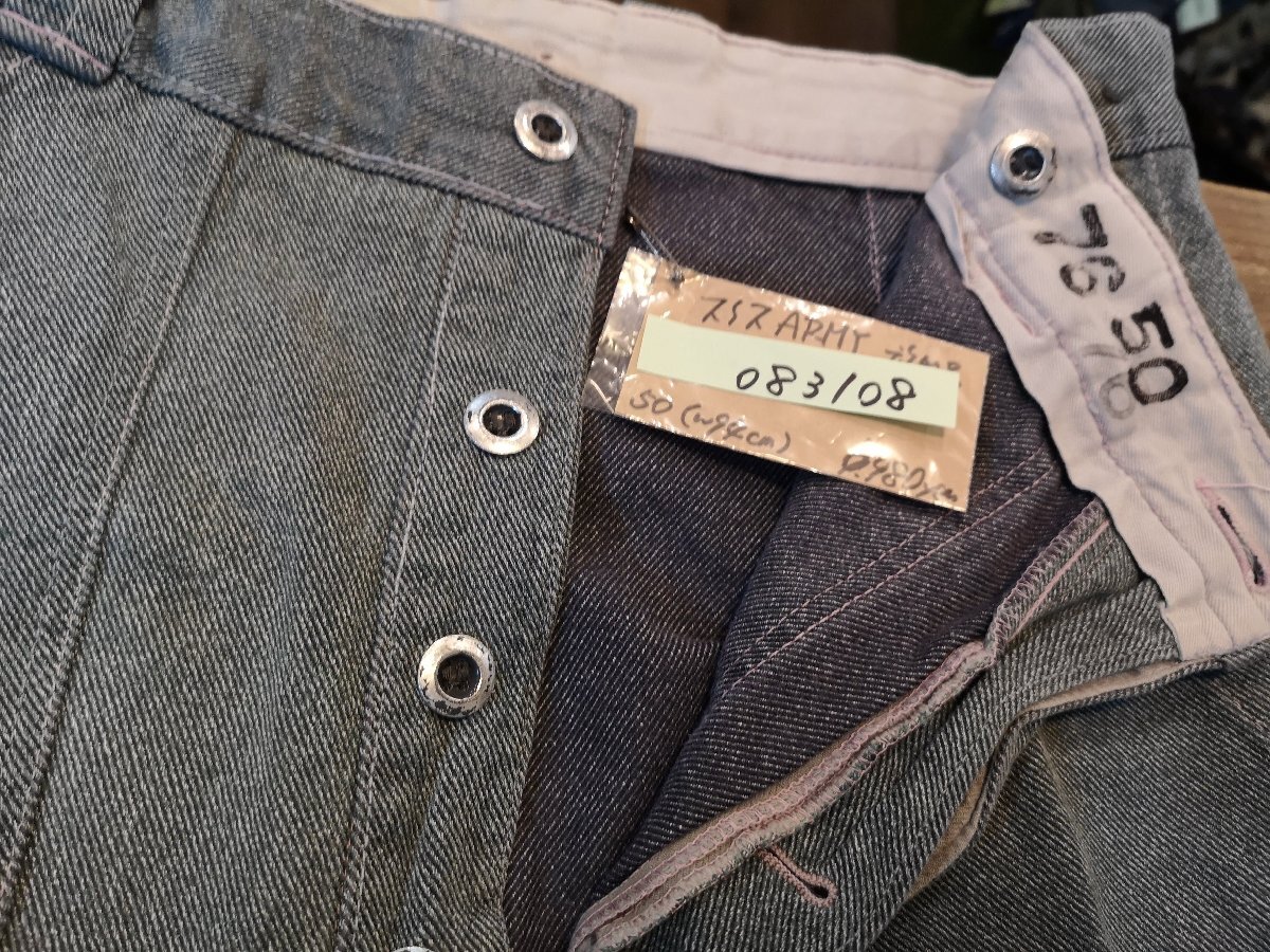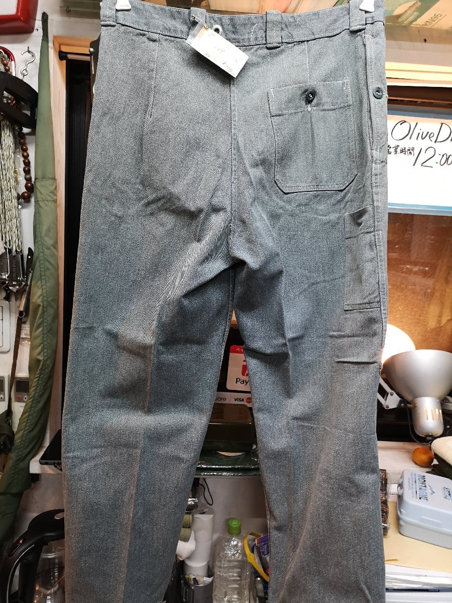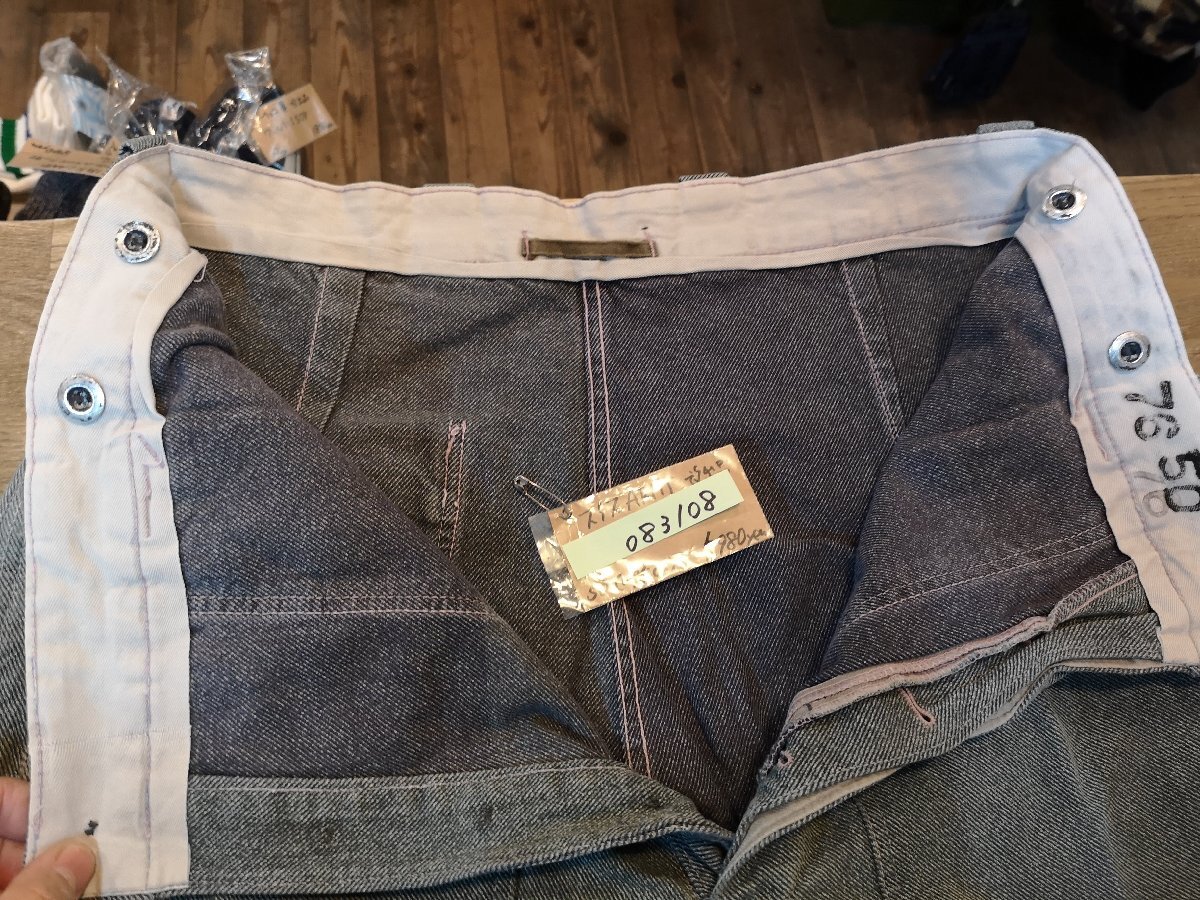 スイス軍放出のアンティークデニム素材のワークパンツの貴重なアルミボタン仕様(3個プラボタンです、内側にサスペンダー用が4個ありますから気になるい方は交換してください)。 全体的には若干の色落ち感ありな感じで、補修は左ひざ部分の生地交換とポケット部分に小さめの物あり。 サスペンダー用のボタンもついています! ポケットは通常の左右のポケットと 左右のスルーポケットで 使い分け出来て便利、 後ろポケットは右側に1個。 フライはボタン留め。実にいい感じの味のパンツに仕上がってます。 サイズ表示50はウエスト94cm、全長109cm、股下76cm 、太もも幅36cm程度。 沖縄離島を除く全国元払い500円でお送りいたします。落札価格にプラスでお願いします。