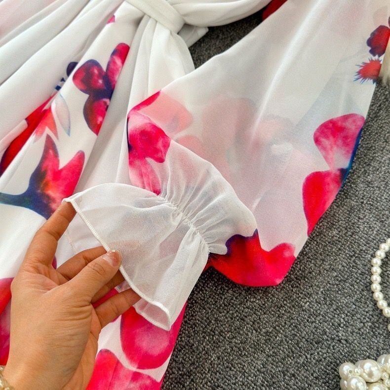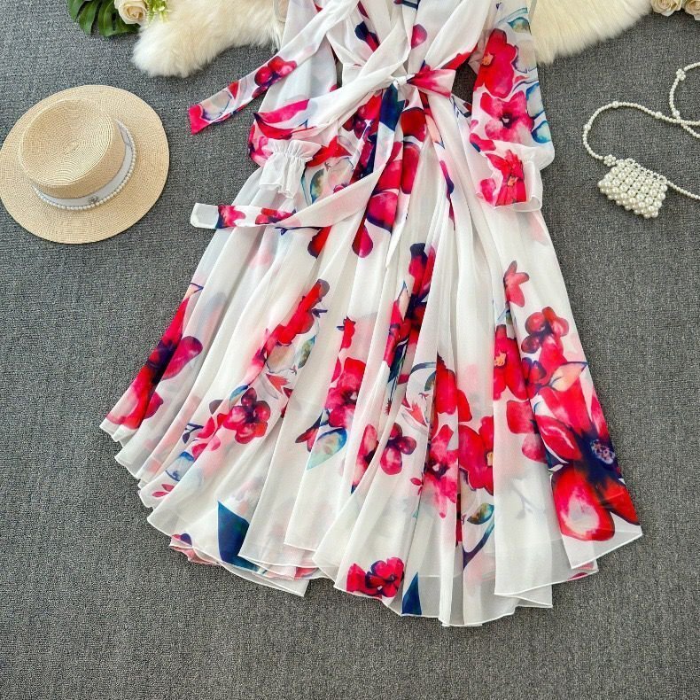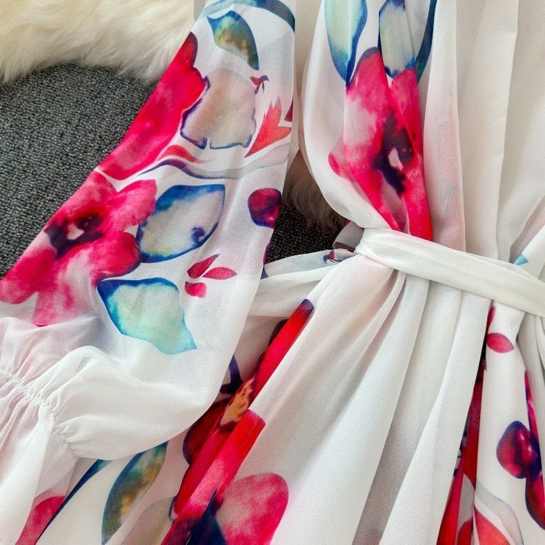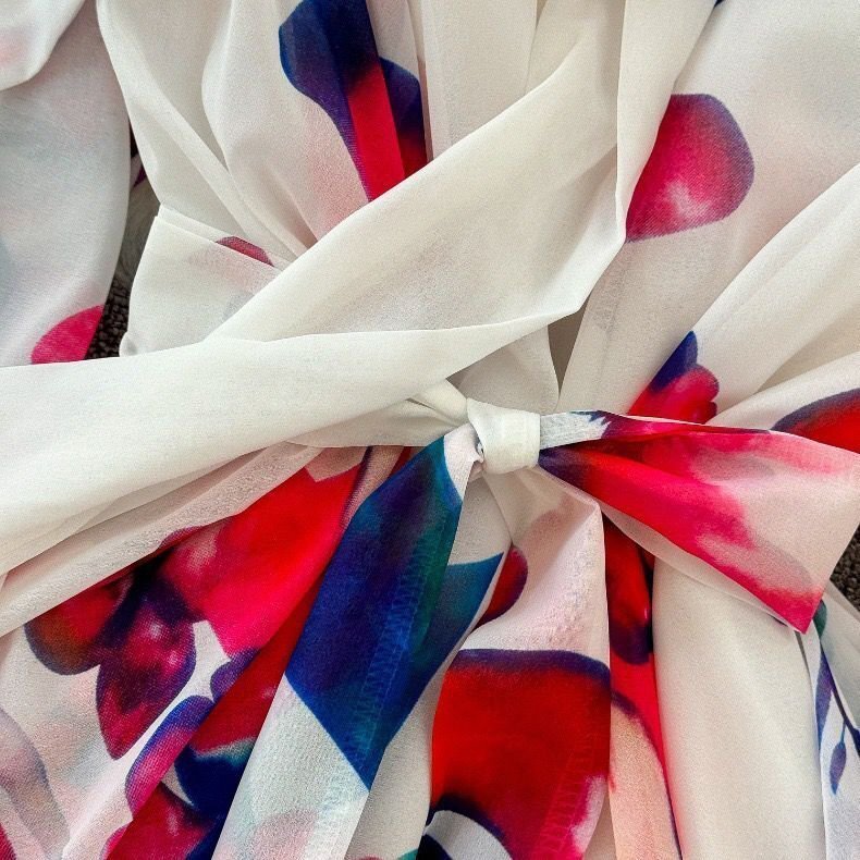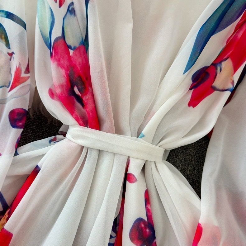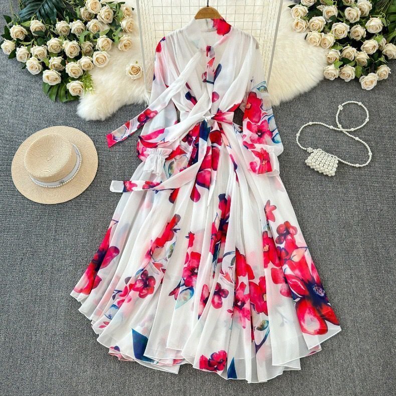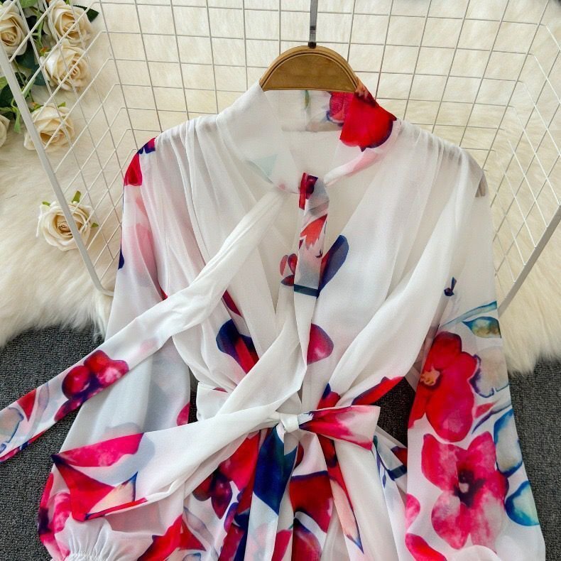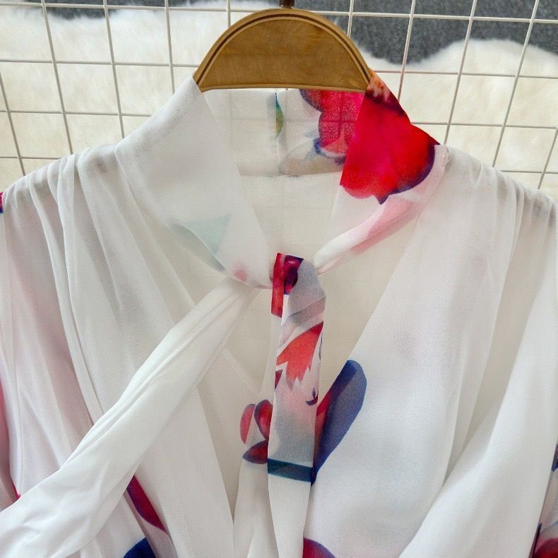 カラーは柔らかく優しい雰囲気のあるホワイトとなり、爽やかで垢抜けた印象のコーデに仕上がります。襟元にリボンタイ付きでおしゃれで大人女性の優しいイメージを作ってくれます。全体的には大人に似合う花柄をセンス良く落とし込み、季節感たっぷり!!目を引く高級なワンピースに仕上がりました。