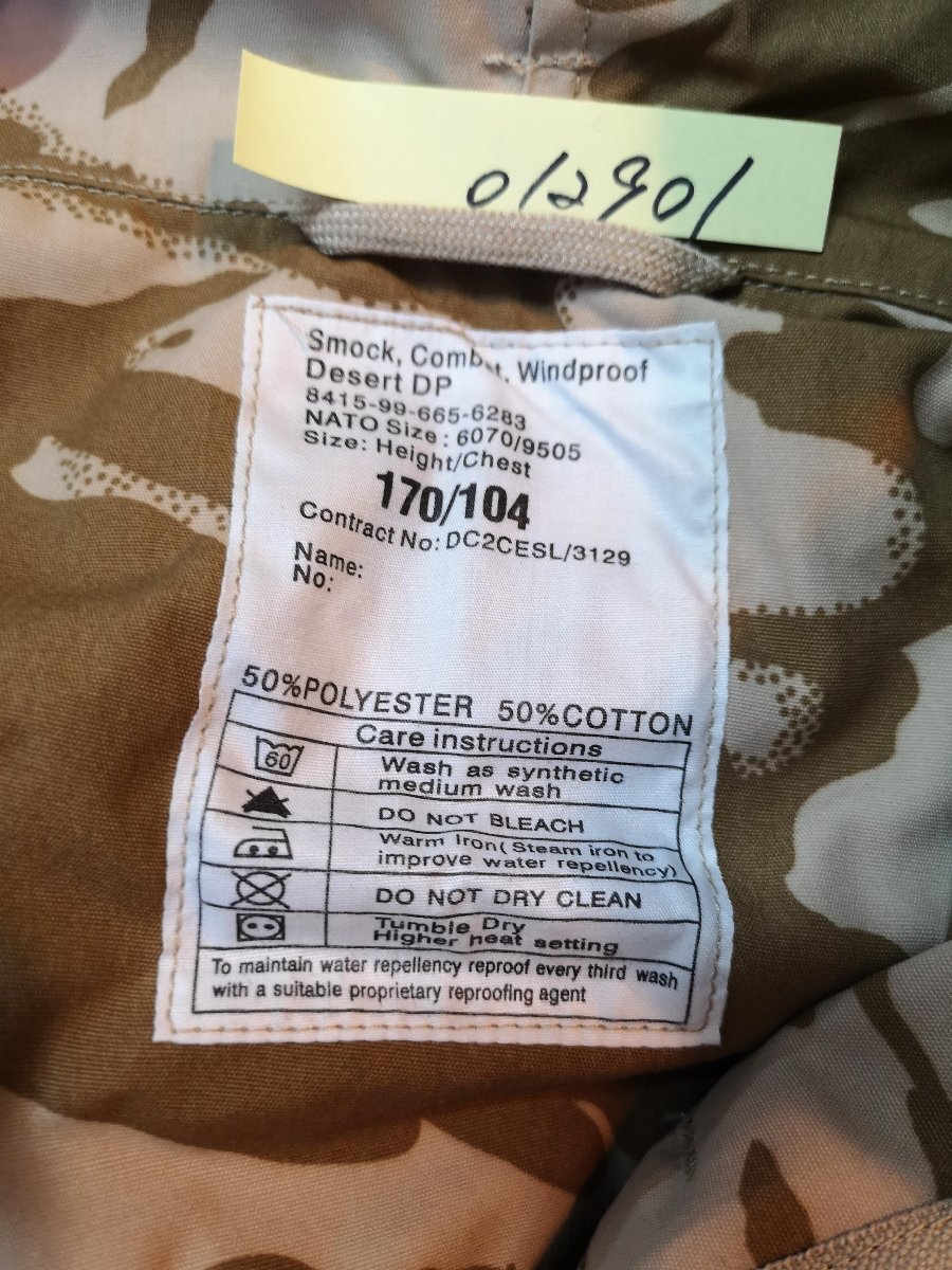イギリス軍本物デッドストックです。生地は50/50の綿ポリで風を防ぐ為のパーカーですので防水性はありません。フードは襟に降りたんで収納可能で、フードの入り口部分には針金が入っていますのですね。前はファスナーとベルクロ留め両用、ポケットはカーゴポケットが4つとファスナーの胸ポケットが2こで収納力抜群。 素材は綿ポリの50/50です。 サイズ表記は170/104で身長が170から180センチ程度で、胸囲が104cm程度の方向けとなります。 実寸は着丈85センチ、身幅68センチ、肩幅54センチ、袖64センチ程度です。 沖縄離島を除く全国500円でお送りいたします、落札価格にプラスでお願いいたします。