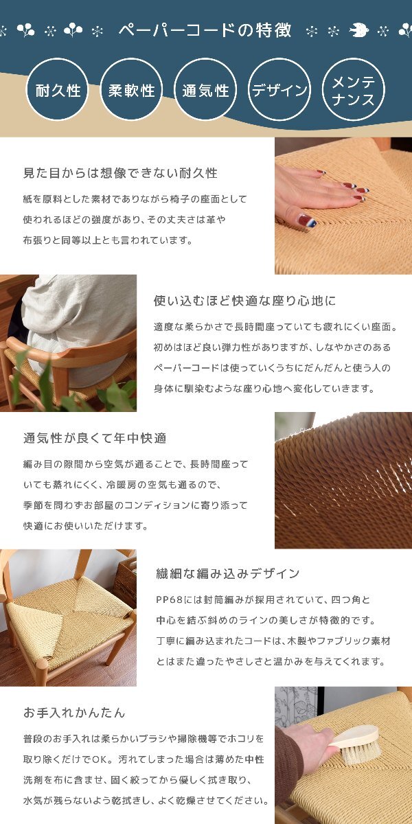 ペーパーコードで編まれた座面は座り心地も柔らかく、