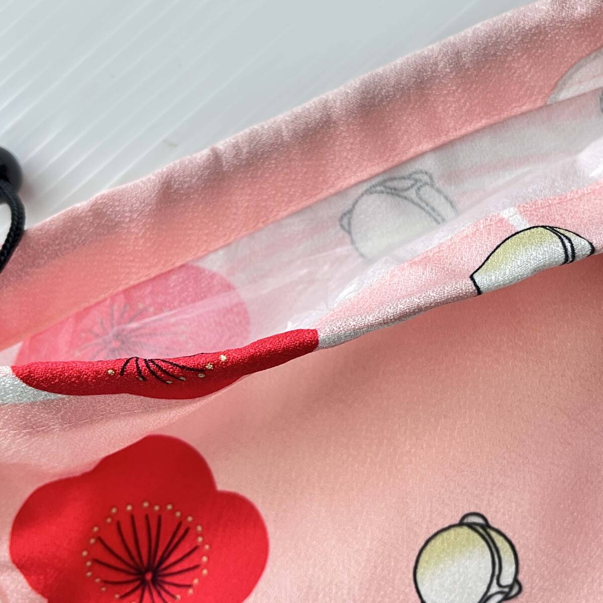 少し表面にシボがある生地です。表はほんのりピンク色に梅柄です。黒い紐が通してあります。使い道は色々。貴重品や化粧小物などを入れて大きめバッグの小分け袋として使えますし、お正月に着物でそぞろ歩きする時のスマホやお財布用の巾着バッグとしても使えます。また、内側に防水のビニール袋が縫い付けてあるので、濡れたもの、液漏れしそうなものの収納にも便利です。ビニール袋が気になる方は、入れ口の三つ折り部分の真下ではさみで簡単に切り取って取り外し可能です。