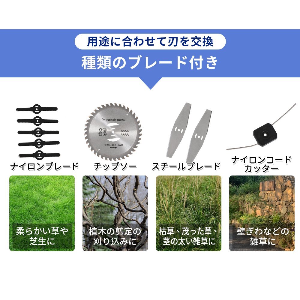 • 【用途に合わせて刃を交換種類のブレード付き】ナイロンブレード:柔らかい草や芝生にチップソー:植木の剪定の刈り込みにスチールブレード:枯草、茂った草、茎の太い雑草にナイロンコードカッター:壁ぎわなどの雑草に
