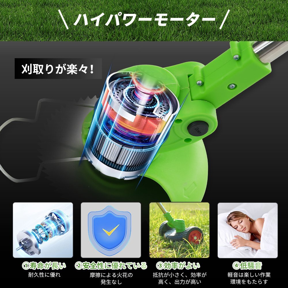 • 【ハイパワーモーター】刈取りが楽々!①寿命が長い耐久性に優れ②安全性に優れている摩擦による火花の発生なし③効率がよい抵抗が小さく、効率が高く、出力が高い④低騒音軽音は楽しい作業環境をもたらす