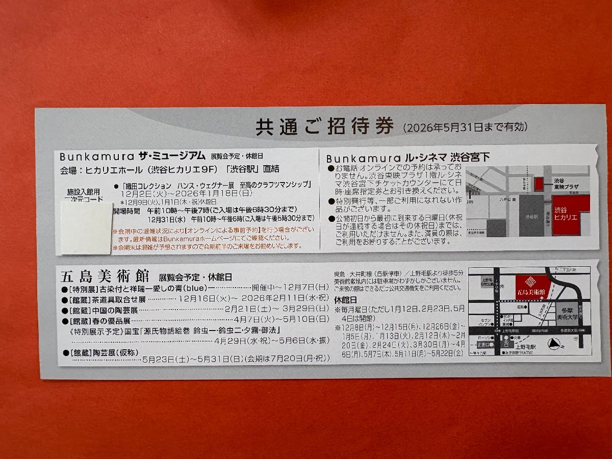 1~4枚☆東急株主優待・Bunkamuraザ・ミュージアム ル・シネマ渋谷宮下&五島美術館・招待券☆2026年5月31日期限♪