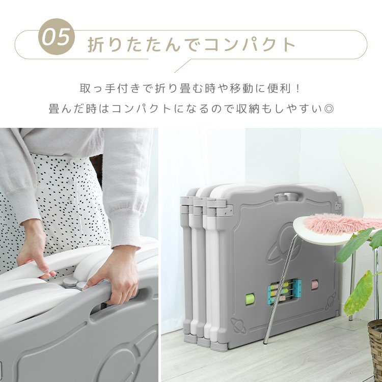 | お子様に安全な軽くて柔らかい素材と丸みを帯びたデザイン! ママにも簡単に組み立てられるベビーサークルです。 赤ちゃんの脳の発達を助けるトイパネルも付いています。 工具不要で組み立て簡単! お好みの形に広げて接続部分のキャップを締めて固定するだけ! 最大スペース約133cm×133cmで広々と遊べます。 外側から扉をロックすることができるので お子様が勝手に外へ出てしまう危険性がありません。 お手入れはサッと拭くだけ! 組み立てたまま拭けるのでお手入れも簡単! いつでも清潔を保てます。 【商品仕様】 内容:パネル ×10 (おもちゃパネル×1、扉パネル×1、パネル×8) サイズ:最大スペース(約)133cm×133cm×高さ60cm 素材ポリエチレン 【カラー】 ・ブルー×ホワイト |