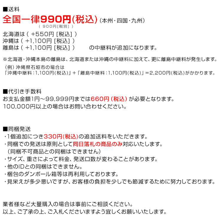 | ▼ 商品に関するお問い合わせはこちら ■対応時間 10:00~15:00 土日祝日休業 ※商品に関するお問い合わせや初期不良等のご連絡はやり取りの履歴を残すために、 お手数ではございますが、必ず下記のメールアドレスにご連絡ください。 jorrp38198@yahoo.co.jp ▼ 営業日・支払い方法・発送・返品・交換・保証に関して ※必ずお読みください 営業日・支払い方法・お届けについて・返品・交換・保証に関する件は、以下のページにて詳しく記載しております。 営業日掲載ページはこちら 営業日カレンダー掲載ページ 支払い方法・お届けについて・返品・交換・保証に関する掲載ページはこちら お買い物ガイド詳細ページ プライバシーポリシーに関する掲載ページはこちら プライバシーポリシー記載ページ ▼ 質問が多かった即決落札について 即決で落札する方法 即決で落札するには ├PC版の場合は、商品画像右の「今すぐ落札する」をクリックします。 └スマホ版の場合は、(1)「入札する」をタップします→(2)最高入札額記入欄に、即決の金額(税抜)をご記入頂ければ即決できます。 入札→即決落札した場合の履歴に関して ご入札頂いているYahoo_IDで即決価格で再度ご落札して頂ければ、前の入札の履歴は残りますが前の分はキャンセルとなり、即決価格のみでのご落札となります。重複しませんのでご安心ください。 ▼ オークションに関して 入札後の各種確認メールについて 当店からの受注確認メール・入金確認メール・発送確認メールが「迷惑メールフォルダ」に自動で振り分ける場合がございます。 「フォルダを空にする」前にメールが届いているか一度ご確認ください。 ご落札の際は、以下3つの当店メールアドレスが届くように受信設定をお願いいたします。 tantobazar@weiec.jp tanto_bazar@yahoo.co.jp jorrp38198@yahoo.co.jp 当店からの各種確認メールは、オーダーフォームに登録のメールアドレス宛に送信されます。 取引方法 手渡しでの直接取引には対応できません。物流業務を委託していますので、 お近くにお住まいの方でも商品のお受け取りに来ていただくことはできません。 在庫について 当社では、卸販売など各方面でも商品を同時販売しております。 在庫情報は随時更新(新規出品の停止、個数少数での出品、出品取り消しなど)させて頂いておりますが、ご落札頂いた際に時間差などで売り切れになる場合もございます。 予めご了承ください。 キャンセル 入札後のキャンセルは一切お受けできません。 やむを得ぬ事情により落札後キャンセルをされる場合には、落札者都合によるキャンセルとなり、 オークションのシステム上自動的に落札者にマイナス評価がつきます。 ご了承ください。 落札後3日以内にご連絡が取り合えないお客様についてはやむを得ずキャンセル処理をさせていただく場合もあります。 交換返品返金について お客様都合での、交換・返品・返金は一切対応できません。 評価について 著しく評価の悪い方の入札はご遠慮願います。 領収書発行について 商品代引きご利用の場合は、伝票が領収書となりますので、別途領収書の発行はできません。 領収書発行希望のお客様は入札後、オーダーフォーム要望欄に必ず「領収書発行希望」をご記入の上ご連絡ください。 商品の価格について 当サイトでは、正確な価格表示に努めておりますが、万が一表示価格やご注文商品の金額に誤りがあった場合、誤表記を理由にご注文を取り消させていただくことがございます。 取り消しに際し、お客様にはメールにて販売価格をお知らせしご注文を継続されるか否かのご確認をさせていただきます。 なお、これによりお客様にご不便やご迷惑をおかけした場合でも、直接的または間接的な損害についての補償は致しかねますことを、何卒ご理解のほどお願い申し上げます。 |