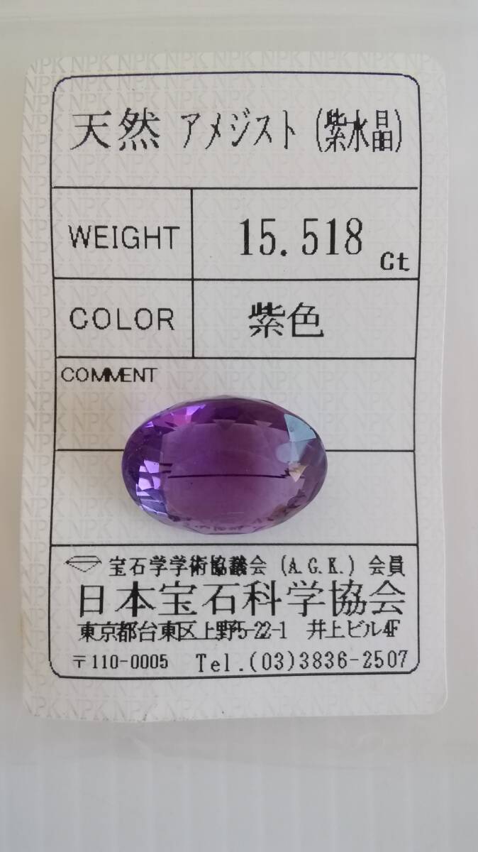 天然 アメジスト(紫水晶) ルース 18x14.9x10.3mm、15.518ct ソーティング付き