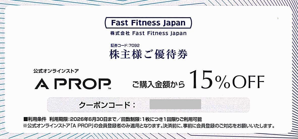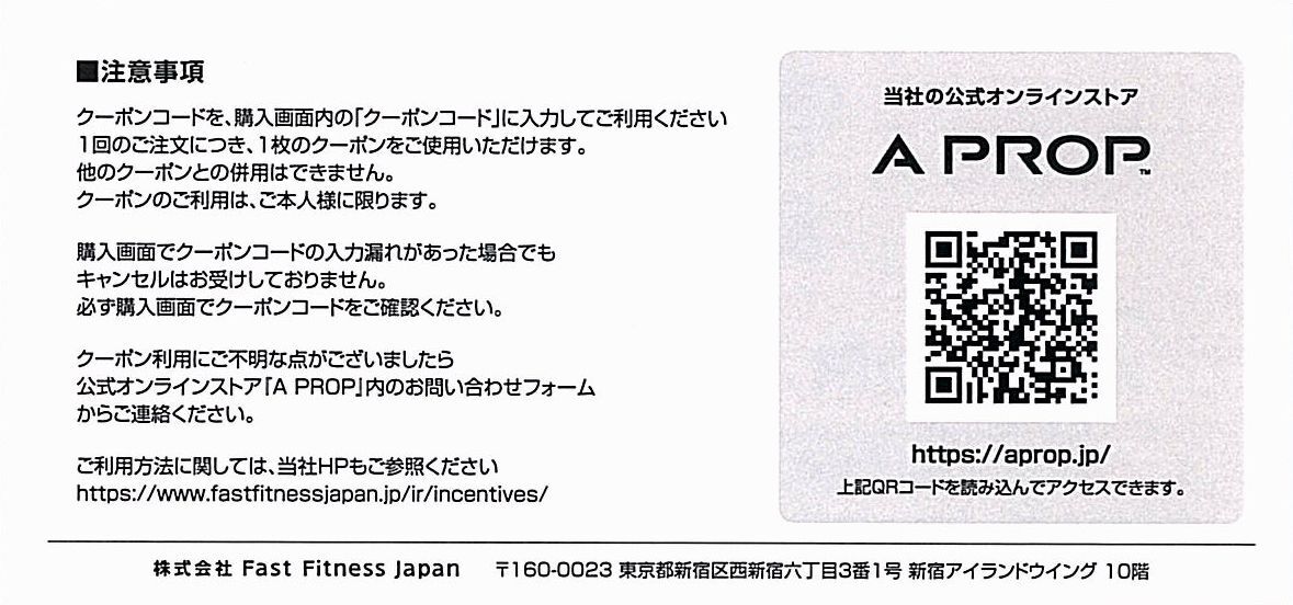 「Fast Fitness Japan 株主優待」 A PROP(ア プロップ)15%割引券【1枚】 / 番号通知のみ / 有効期限2026年6月30日