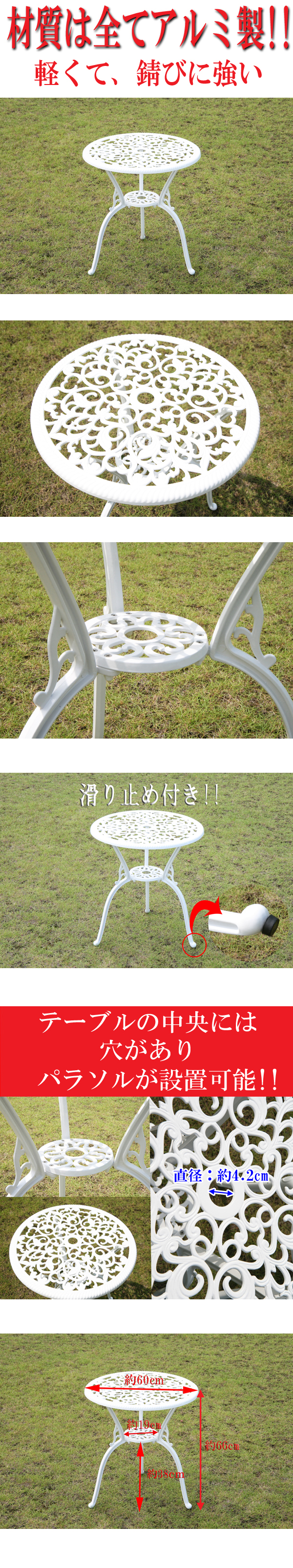 | 商品名 | 送料無料◆アルミ鋳物ガーデンテーブル アルミガーデンテーブル ◆軽量で持ち運び簡単!! ガーデンファニチャー ガーデンテーブル アルミ テーブル キャンプテーブル アルミテーブル アウトドア 鋳物 ホワイト |