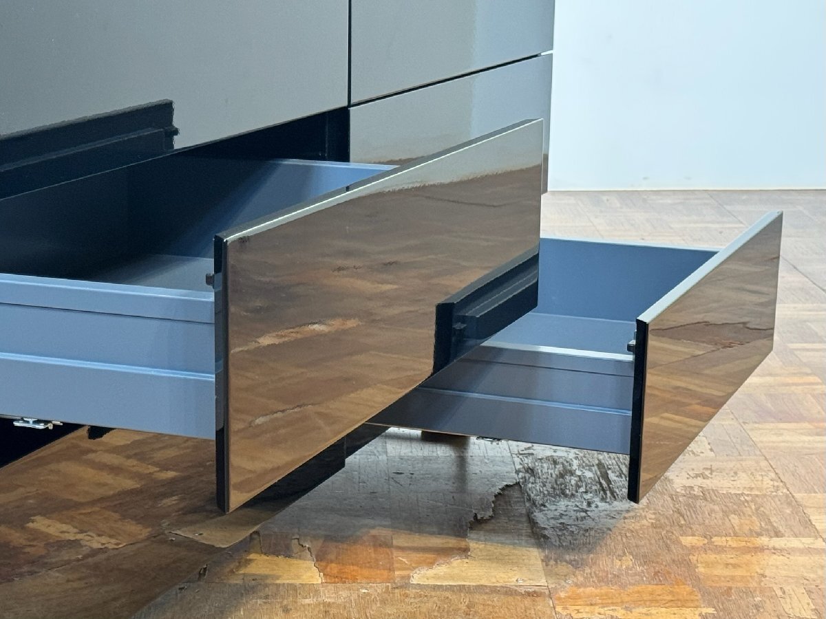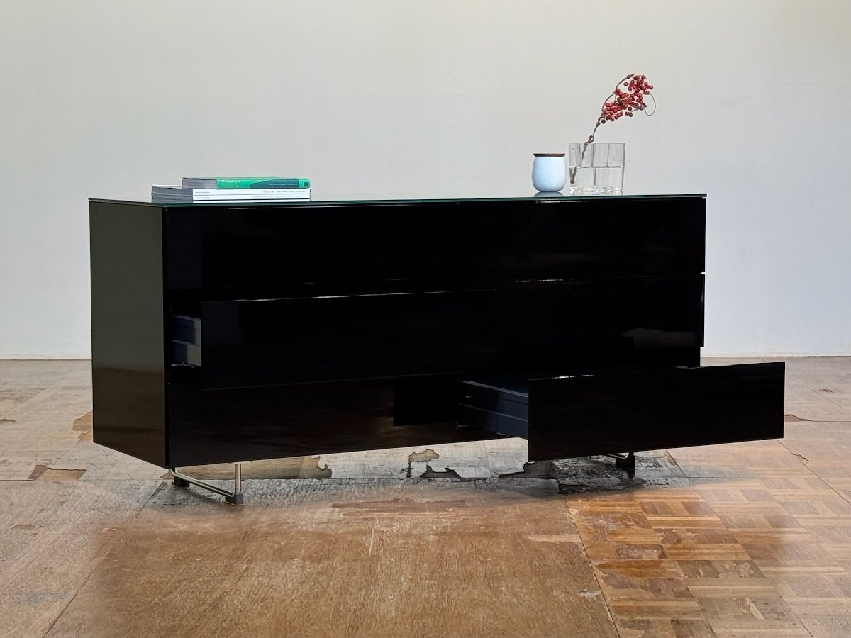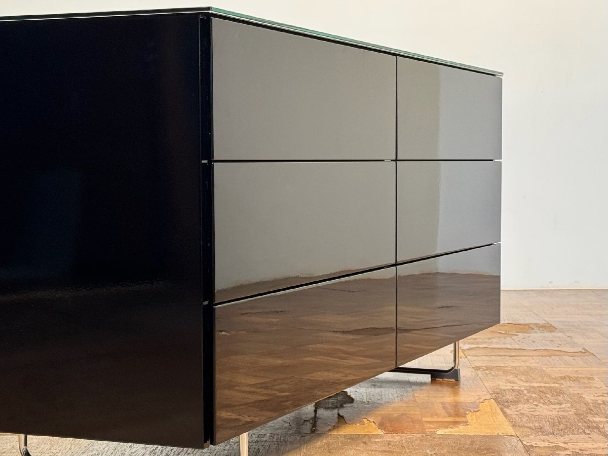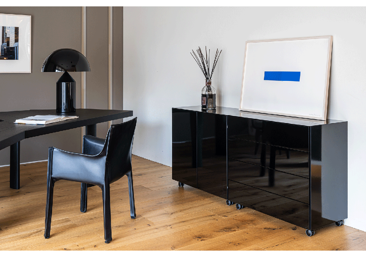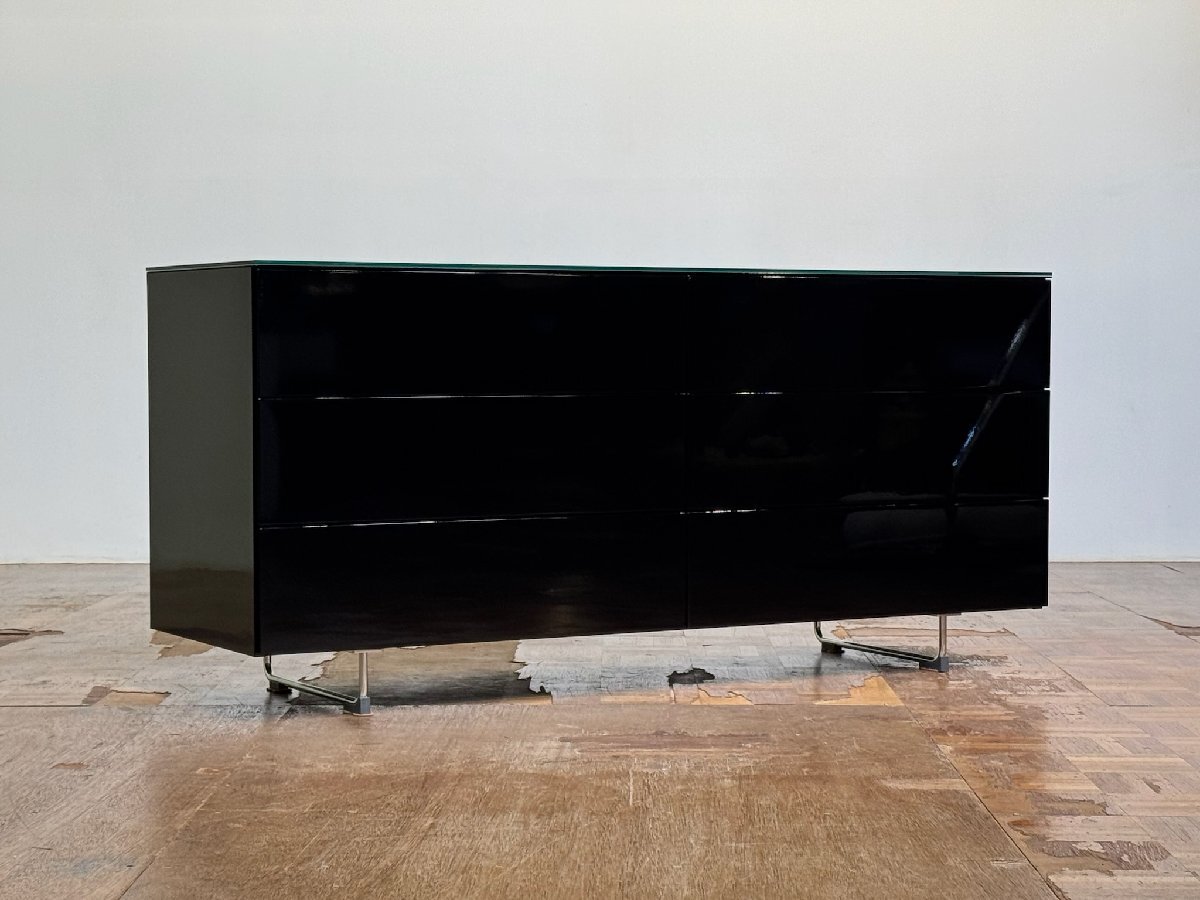 ブランドらしい、リビングシーンを飾るあらゆる名品と調和しつつ、多様な小物を飾りあへる舞台として秀逸な全面スチールで仕上げたクリーンで端正な佇まいで大セラーとして君臨するミニマムローボードドロワーキャビネット。Cassina ixc. より。