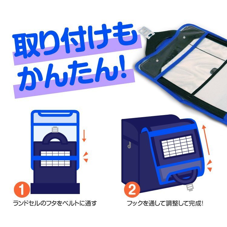 ランドセルのフタをベルトに通して、フックを通すだけなので誰でも簡単に脱着できます