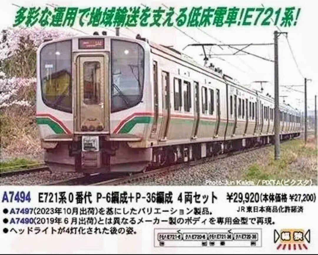 こちらの商品は、2024年12月に発売したばかりのマイクロエース 型番A7494 E721系0番代 4両セット より 【付属パーツ・説明書(行先インレタシール)付のP-36編成 クモハE721-36(M)+クハE720-36】のバラ売り商品 です。