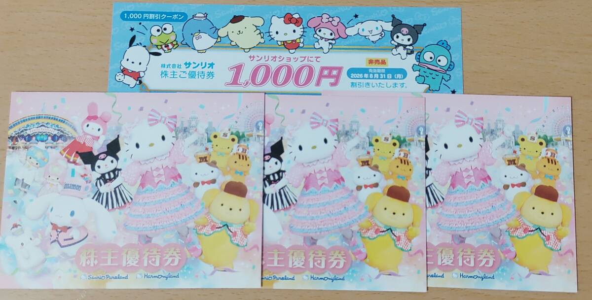 サンリオの株主優待券3枚と、サンリオショップ1000円券1枚です。