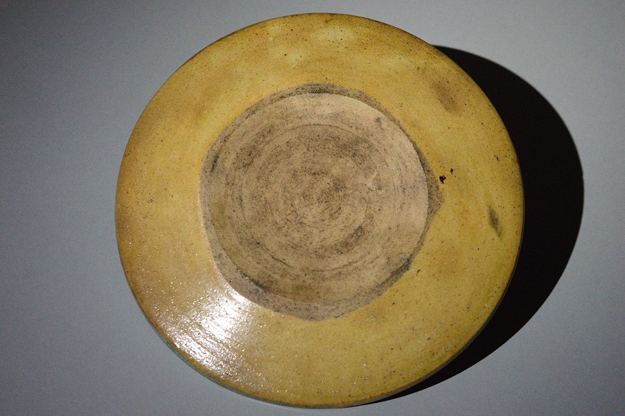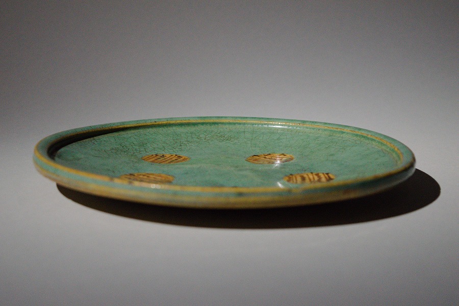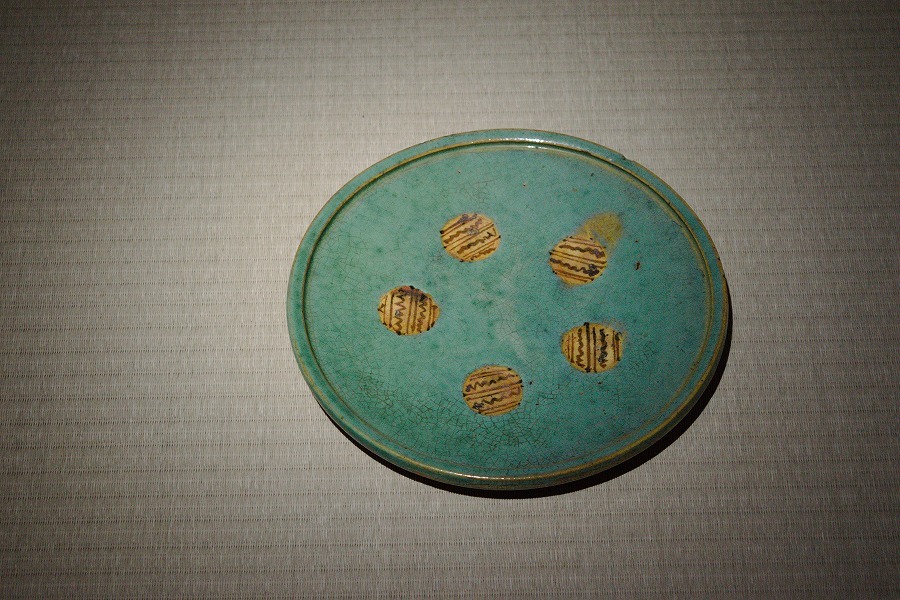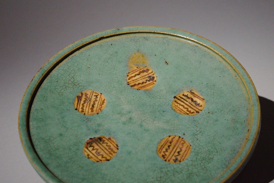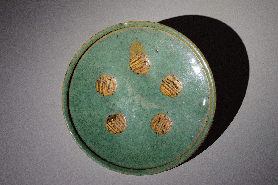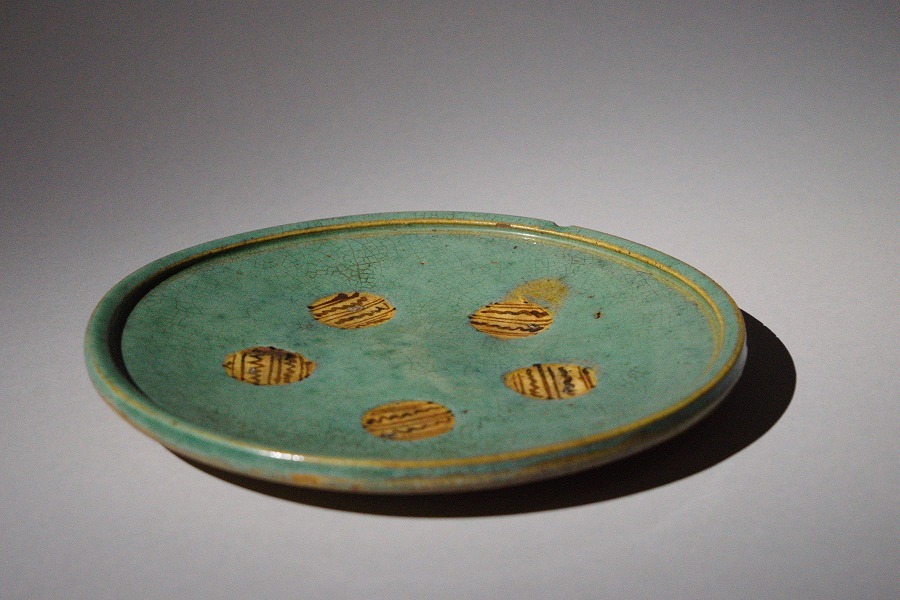 織部丸文行灯皿です。織部といっても江戸後期の瀬戸のやきものですが、全体に織部釉がかけられているので、織部と呼ぶ方がしっくりと来ます。丸文が抜かれていて、有平のような文様が描かれており、手鞠のように見えます。味わい深い民器うまれの骨董皿です。