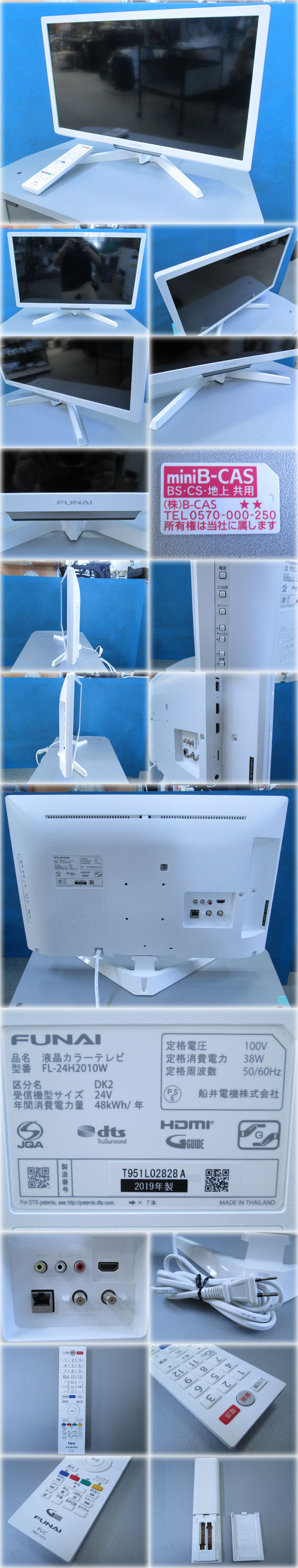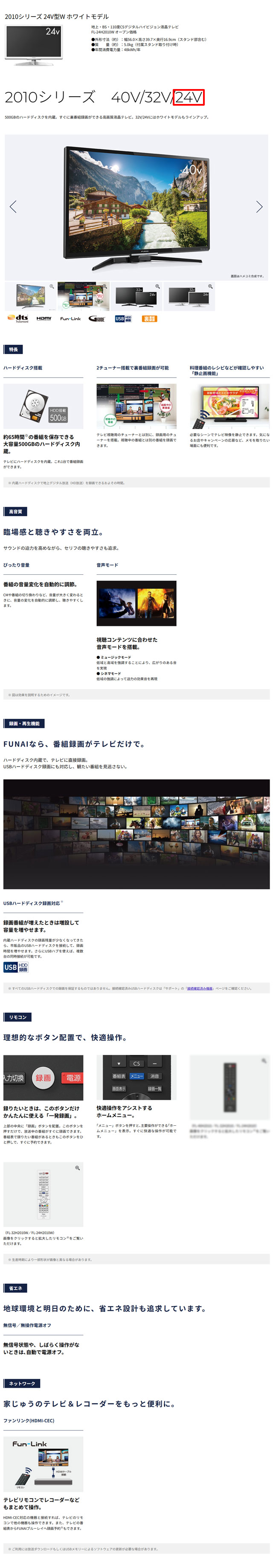 フナイ 24V型液晶テレビ FL-24H2010W を出品いたします。 ■特徴■ 500GBのハードディスクを内蔵。 すぐに裏番組録画ができる 高画質液晶テレビ。 ハードディスク搭載 約65時間※の番組を保存できる 大容量500GBのハードディスク内蔵。 テレビにハードディスクを内蔵。 これ1台で番組録画ができます。 2チューナー搭載で裏番組録画が可能 テレビ視聴用のチューナーとは別に、 録画用のチューナーを搭載。 視聴中の番組とは別の番組を録画できます。 料理番組のレシピなどが確認しやすい「静止画機能」 必要なシーンでテレビ映像を静止できます。 気になるお店やキャンペーンの応募など、 メモを取りたい場面にも便利です。 ぴったり音量 番組の音量変化を自動的に調節。 CMや番組の切り換わりなど、 音量が大きく変わるときに、 音量の変化を自動的に調節し、 聴きやすくします。 録りたいときは、このボタンだけ かんたんに使える「一発録画」。 上部の中央に「録画」ボタンを配置。 このボタンを押すだけで、 放送中の番組がすぐに録画できます。 番組表で録りたい番組があるときも このボタンをひと押しで、すぐに予約できます。 快適操作をアシストするホームメニュー。 「メニュー」ボタンを押すと、 主要操作ができる「ホームメニュー」を表示。 すぐに快適な操作が可能です。 無信号/無操作電源オフ 無信号状態や、しばらく操作がないときは、 自動で電源オフ。 ファンリンク(HDMI-CEC) テレビリモコンでレコーダーなどもまとめて操作。 HDMI-CEC対応の機器と接続すれば、 テレビのリモコンで他の機器も操作できます。 また、テレビの番組表から FUNAIブルーレイへ録画予約※もできます。 ■仕様■