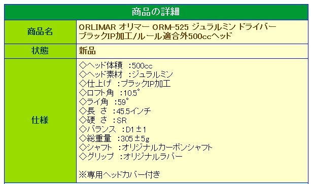 | 商品名 | ORLIMAR オリマー ORM-525 ジュラルミン ドライバー ブラックIP加工/ルール適合外500ccヘッド |