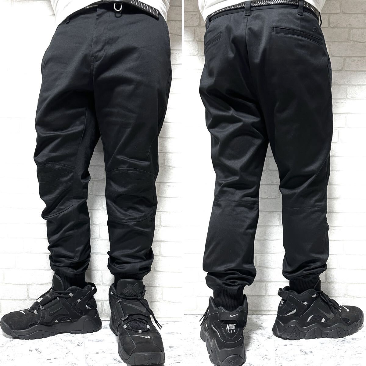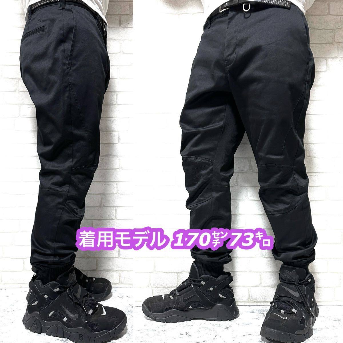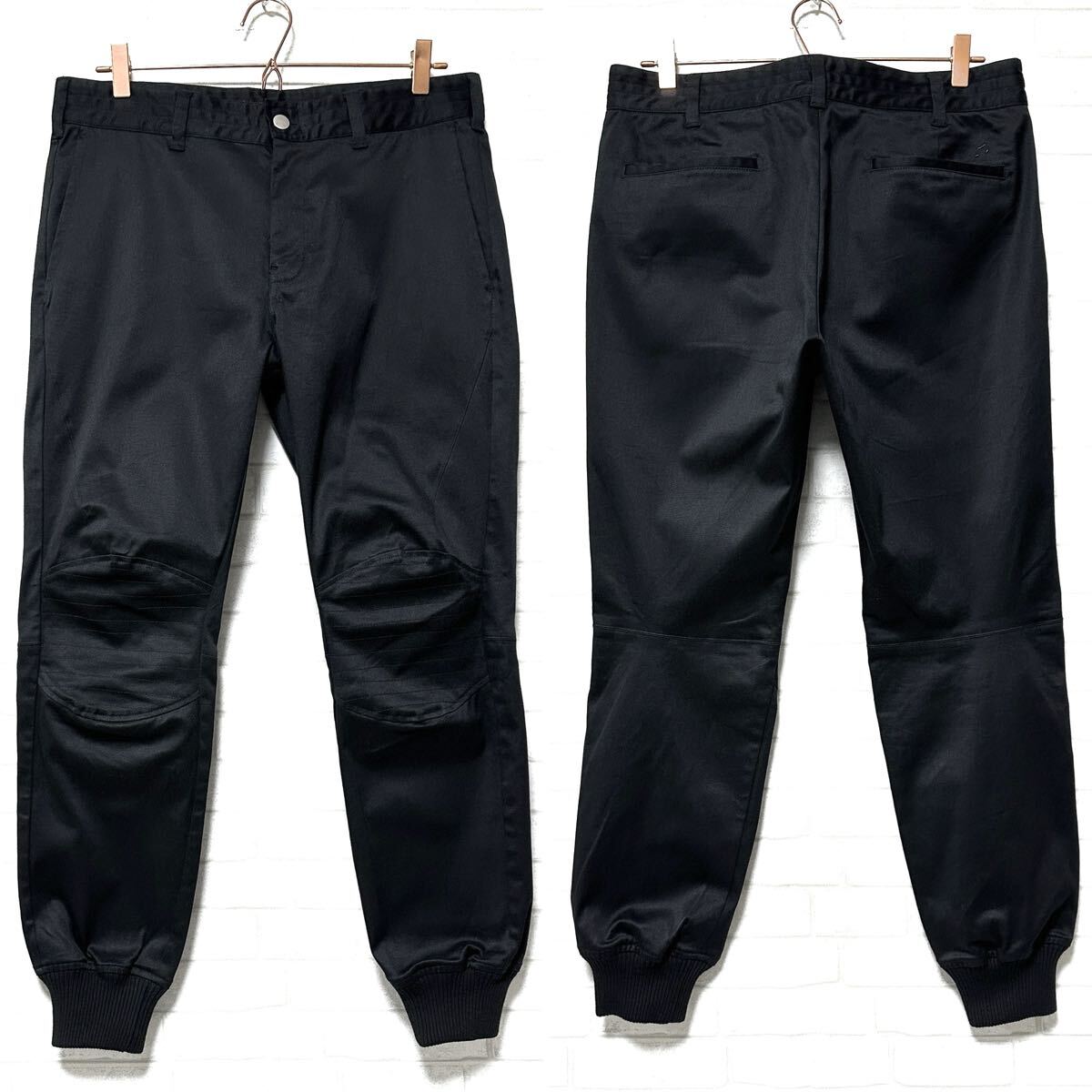 ☆ストレッチ素材を使用した伸縮性のある快適な穿き心地。裾口はリブが配されたジョガーパンツ仕様◎更に膝部分には切り替えデザインが配されたバイカー、ライダー仕様のボトムスに仕上げています。