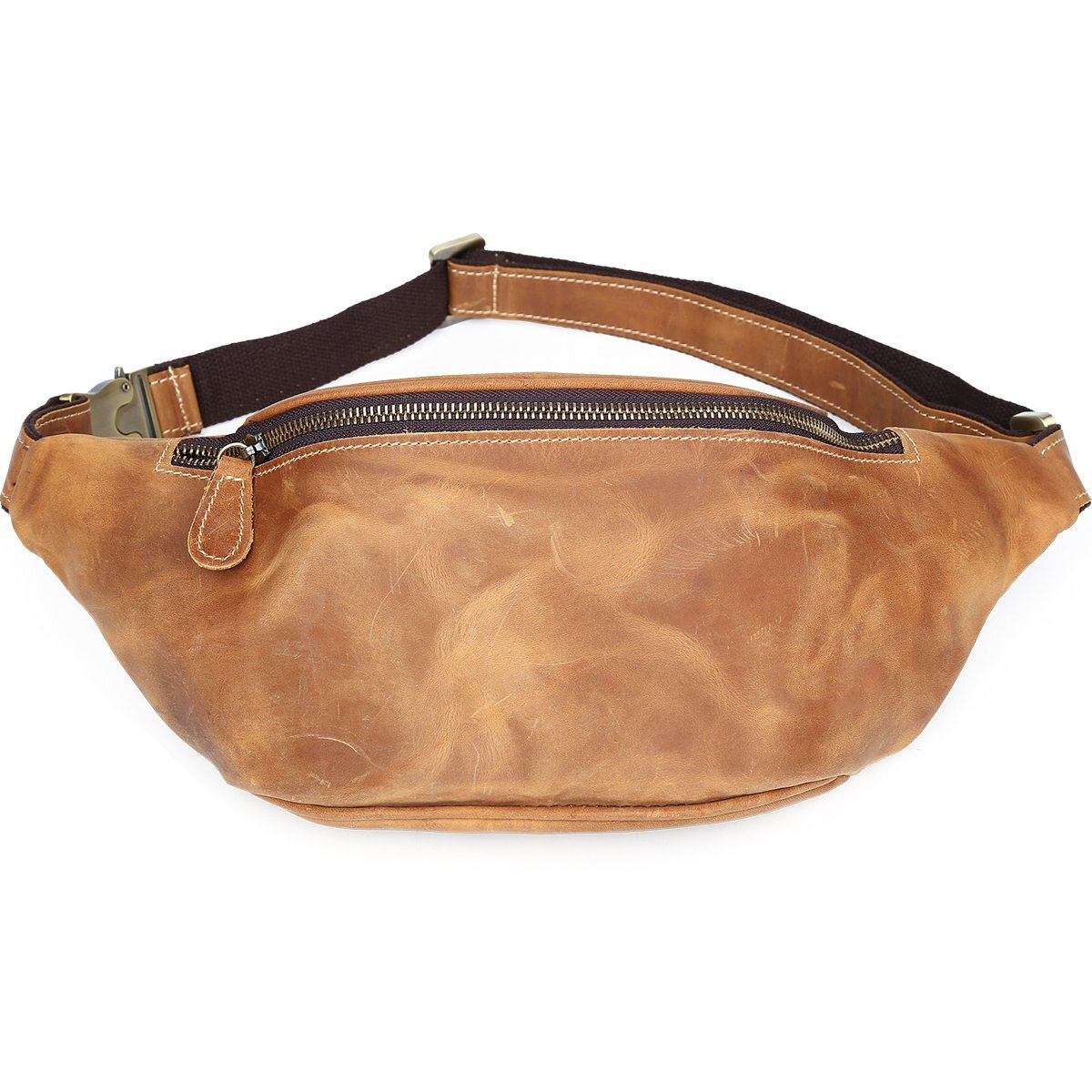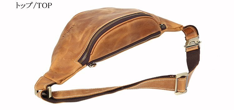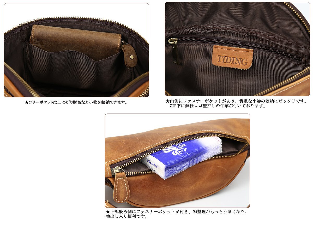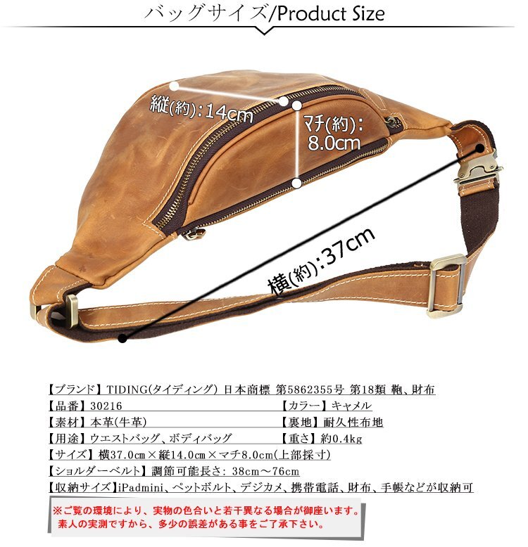 TIDING 三日月型 本革 ウエストバッグ ヒップバッグ 2WAY ボディバッグ 厚手牛革 経年変化 iPadmini対応 男女兼用 キャメル 潮牛