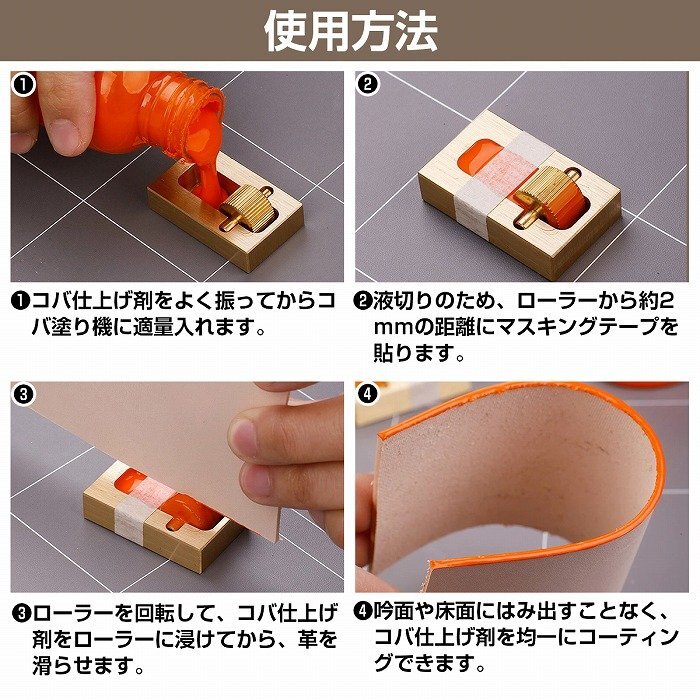 4.吟面(銀面)や床面にはみ出すことなく、コバ仕上げ剤を均一にコーティング可能です。