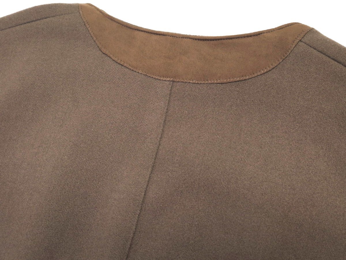 襟元には、本来のチェスターコートのラペル(衿)裏にあるフェルテースをイメージした