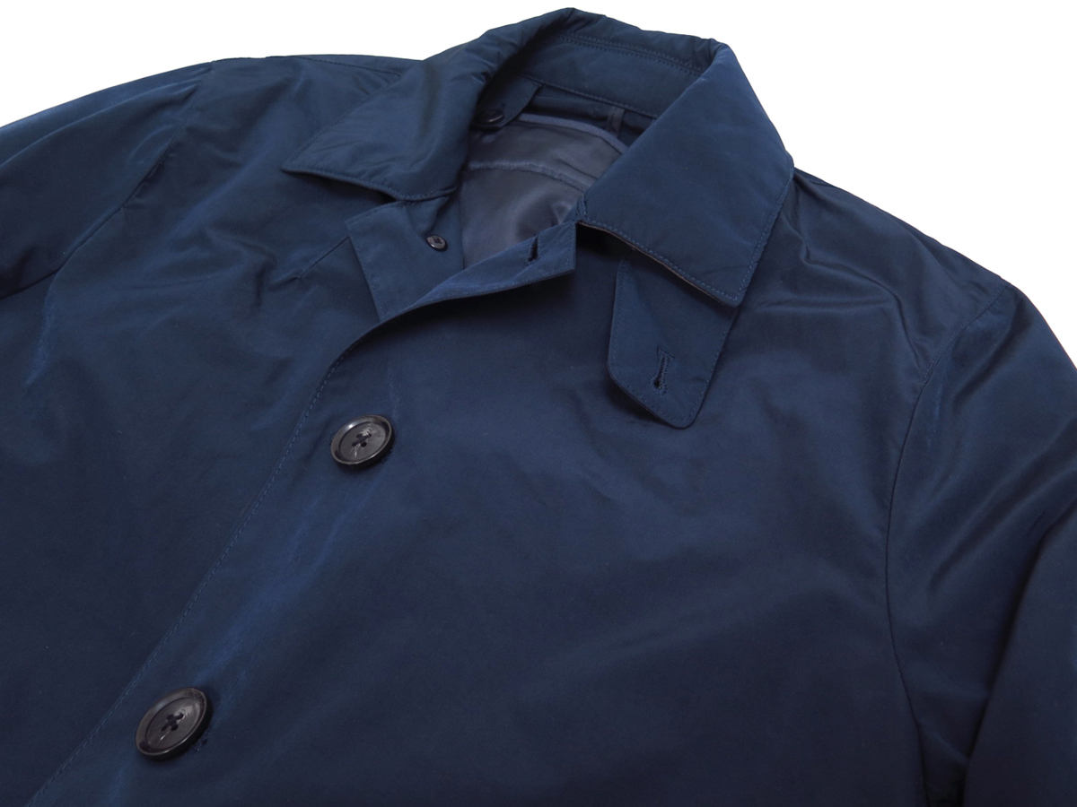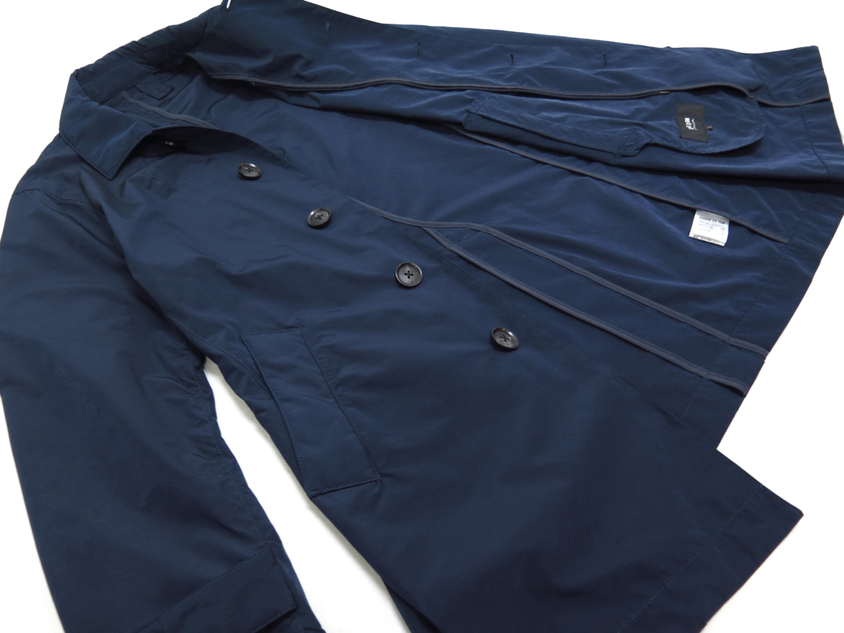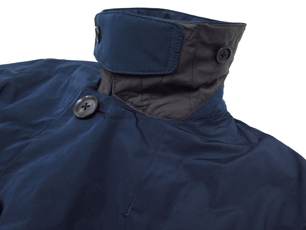 ポリエステルのハリ・コシとナイロンのソフト感を兼ね備えた、ドライなパウダータッチの素材を使用したステンカラーコート。