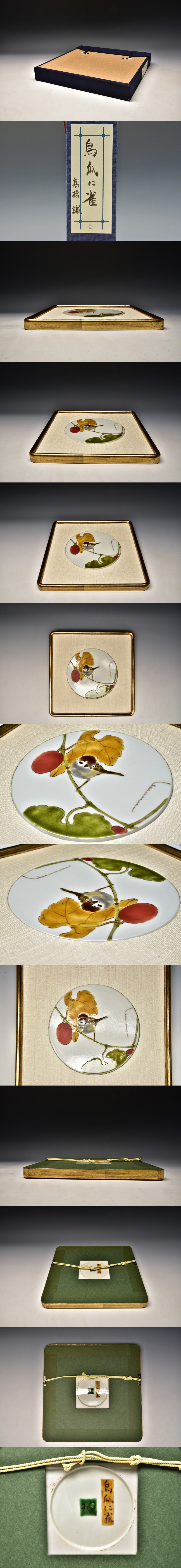 U08859 東京芸大 高橋誠 色絵磁器 陶額 烏瓜に雀 共箱 /G305