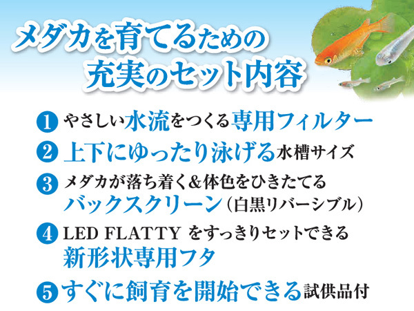 【セット内容】 水槽、フタ、フィルター、エアーポンプ、エアーチューブ、エアー調節バルブ、水質調整剤、バックスクリーン、メダカ飼育BOOK