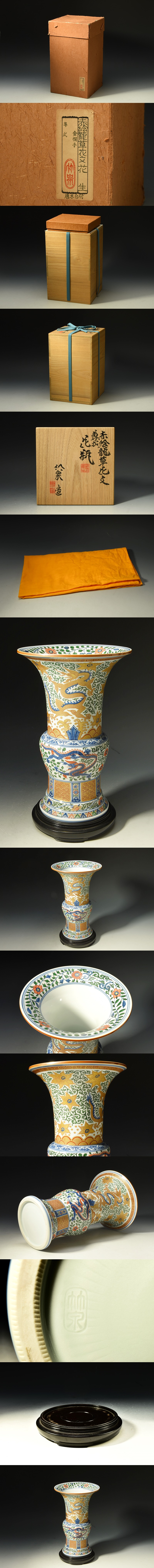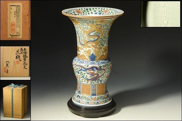 U07805 三浦竹泉 赤絵 金襴手 龍草花文 尊式 花瓶 花生 花器 唐木台付 共箱 /3F