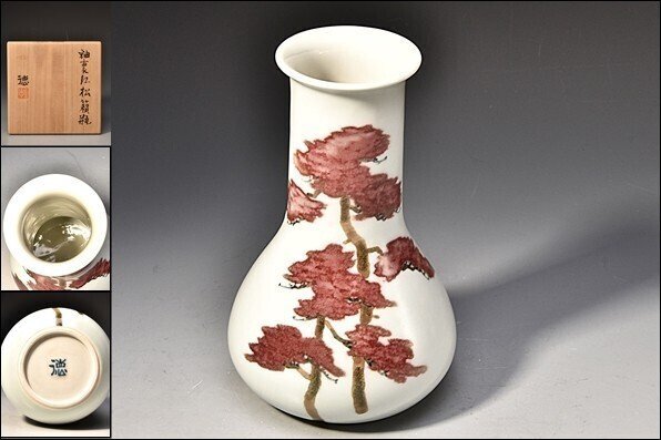 U08746 日本芸術院 河合誓徳 釉裏紅 松籟 瓶 共箱 /G260