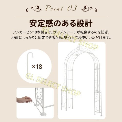 • ◎03【安定感のある設計】アンカーピン18本付きで、ガーデンアーチが転倒するのを防ぎ、地面にしっかりと固定できるため、安心してお使いいただけます。