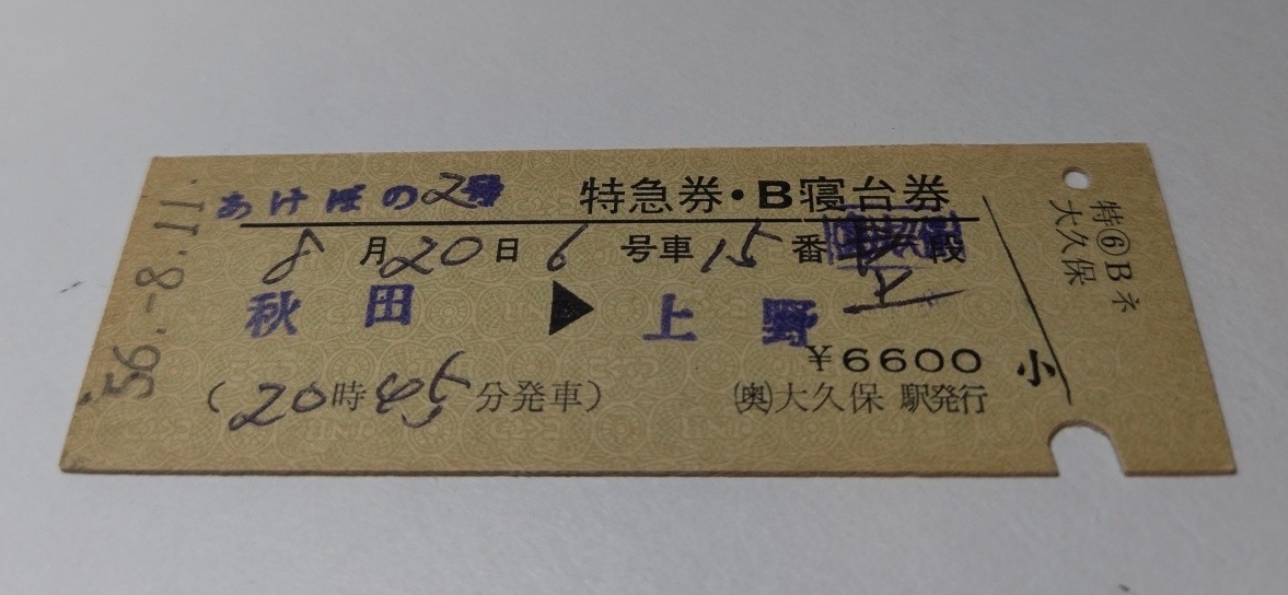 (13)国鉄 常備 特急券・B寝台券『あけぼの2号』(奥)大久保駅発行