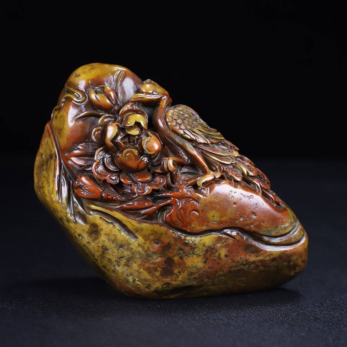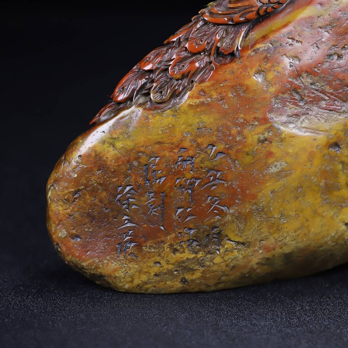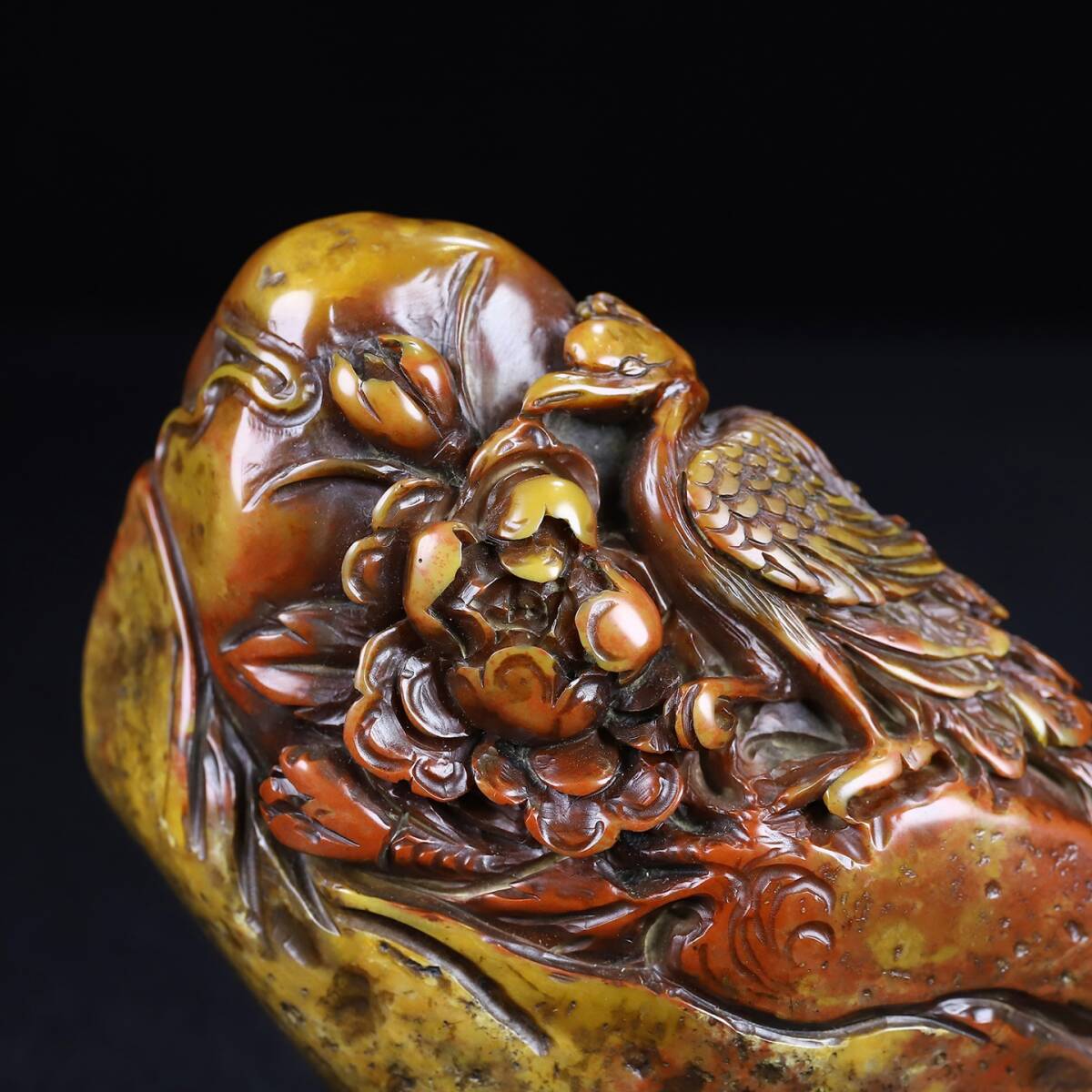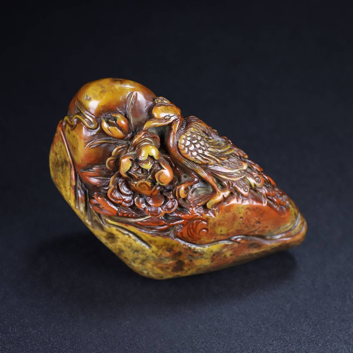 館蔵 寿山石彫 孔雀戲牡丹 印鑑 印章 天然石 手彫 篆刻 古印材 極細工 中国古玩 古美味 骨董品 中国古美術 古美味 蔵出