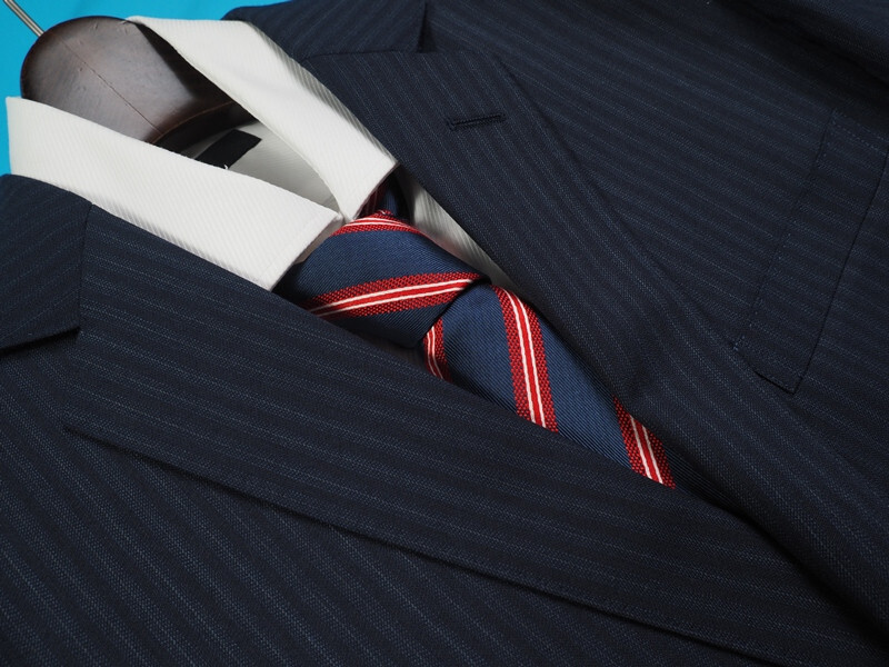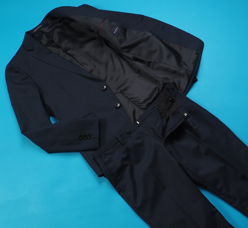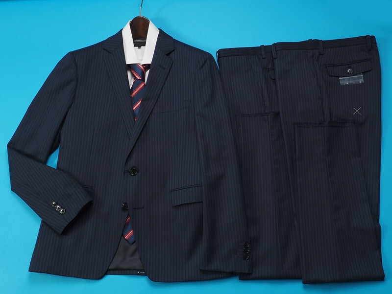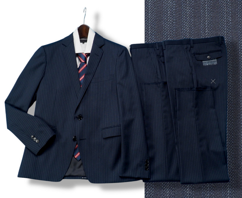 新品 大手百貨店扱い 秋冬総裏 ウール混 ギャバジン ストライプ ツーパンツ スーツA4紺(B) 1145072