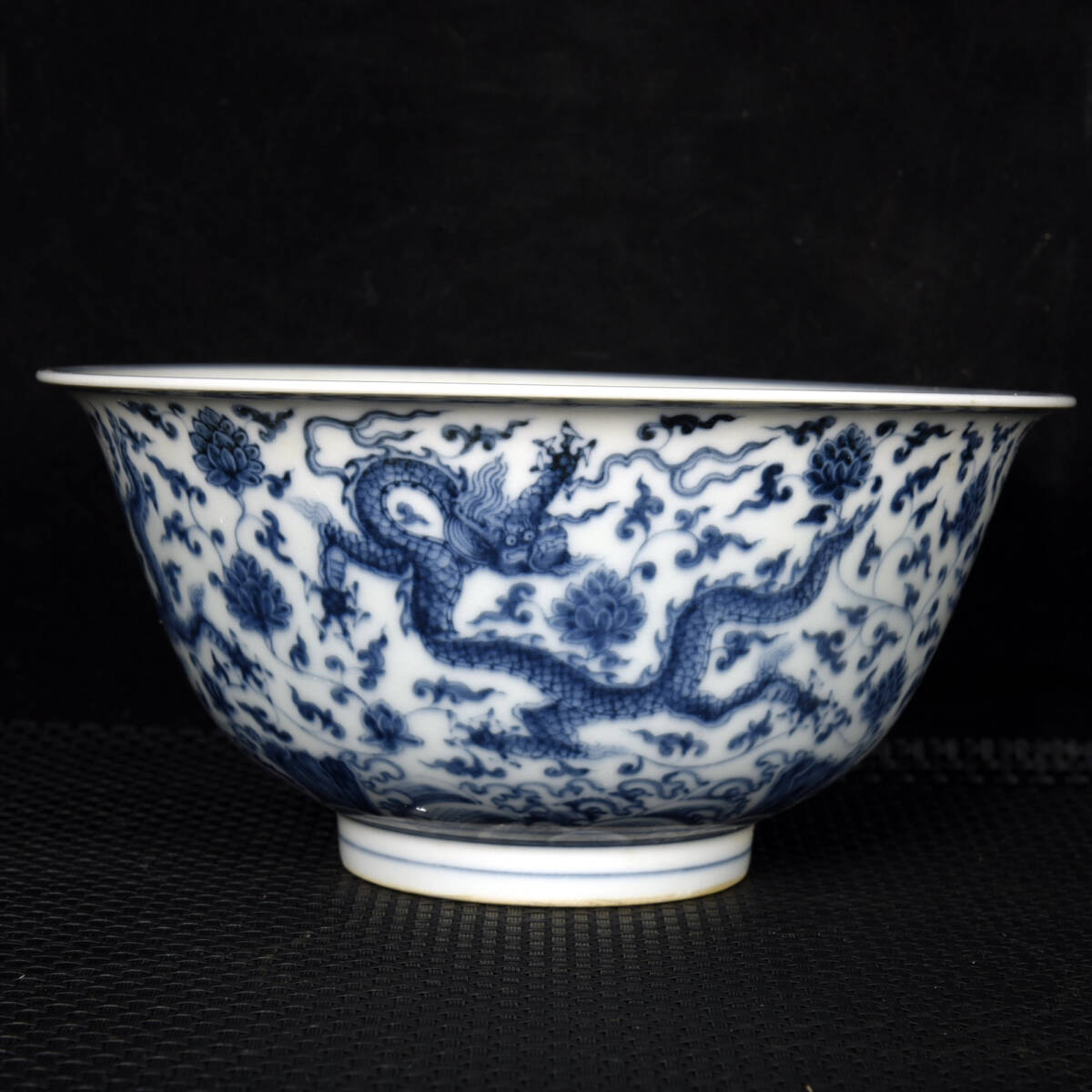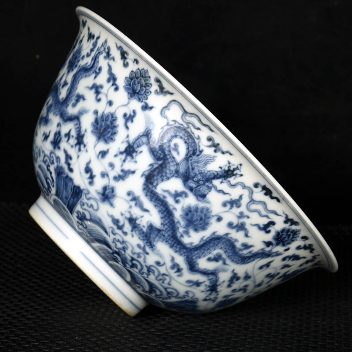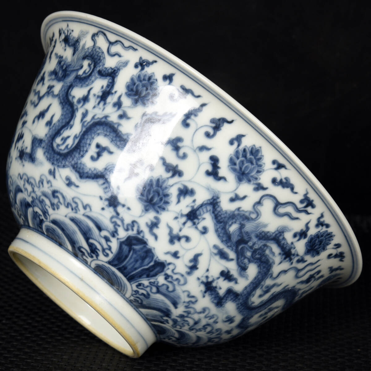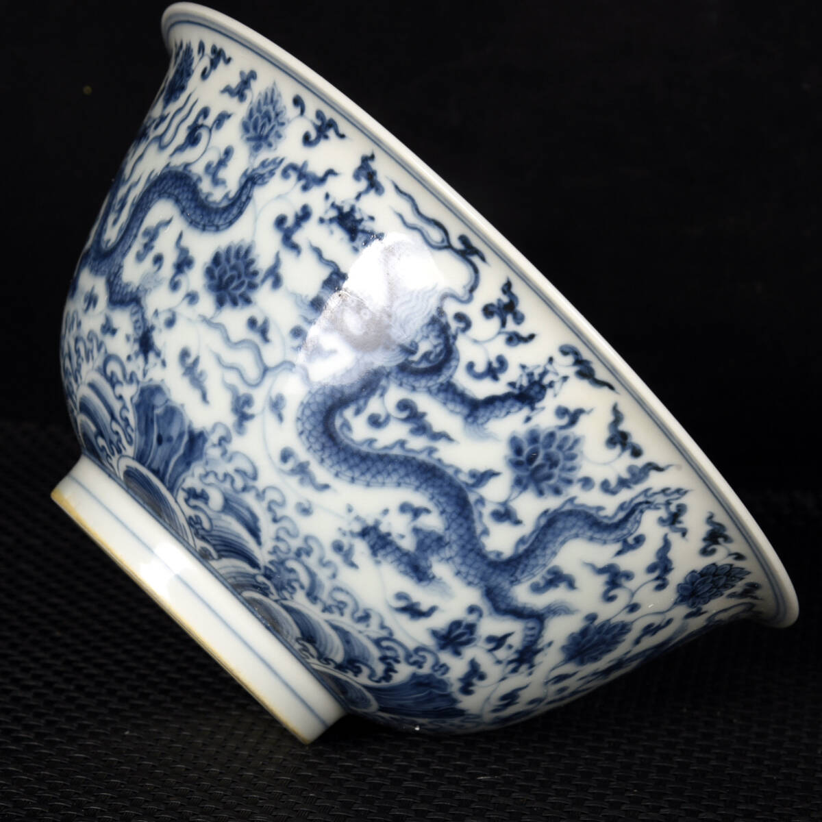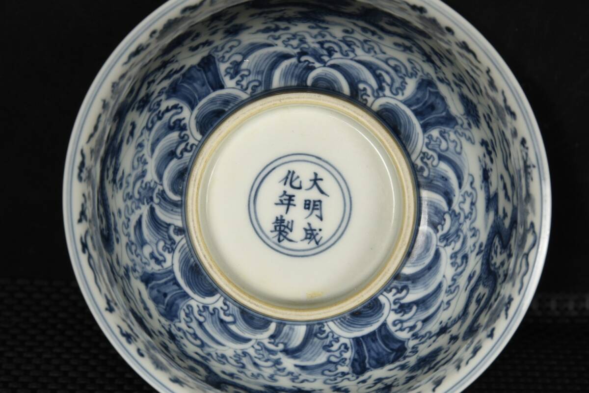 館蔵 大明成化年製 青花 海水 五龍穿花紋 碗 古陶瓷 陶磁器 時代物 稀少 中国古玩 古美味 骨董品 中国古美術 古美味 蔵出