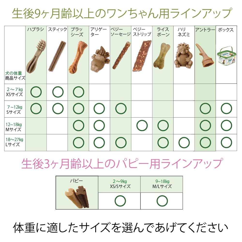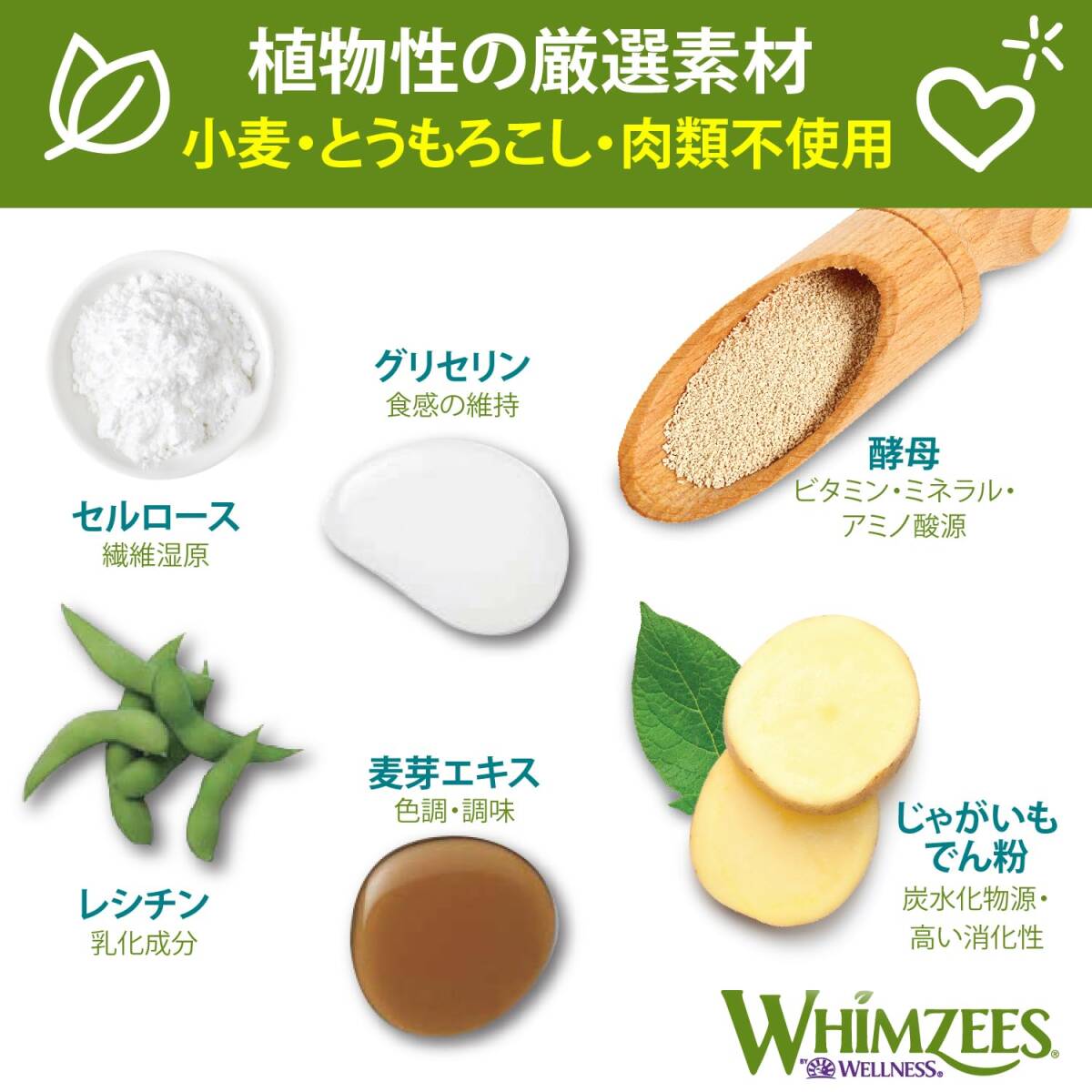 商品紹介 ウィムズィーズは植物由来の厳選素材を使用したデンタルトリーツです。ユニークな形状と噛み応えのある硬さで、ワンちゃんが楽しく長く噛むことをサポートします。長く噛むことにより、歯垢や歯石の減少、口臭予防に役立つだけでなく、ストレスケアにもなります。原材料の種類を限定しているので安心して与えていただけます(主要原料6種類)。動物性の原材料・小麦・トウモロコシは一切不使用。人工着色料、香料、合成保存料不使用。オランダ産(原材料は全てヨーロッパ産)。 使用上の注意 ●愛犬の体重に適したサイズを与えてください。●のどに詰まらせないよう必ず食べ終わるまで目の届くところで与えてください。●興奮時には与えないでください。●歯、歯ぐき、あごが健康な犬に与えてください。●飲み込んでしまう場合は手にもって最後までしっかり噛ませてあげてください。●製品の色、形状にばらつきがあることがございますが、品質には問題ありません。 原材料・成分 じゃがいもでん粉、セルロース、酵母、麦芽エキス、ルピナス、グリセリン、レシチン 使用方法 ●1日1本を目安に、主食の量を適宜調整して健康状態にあわせて与えてください。●常に新鮮な水をご用意ください。●生後9か月以上の愛犬に与えてください。
