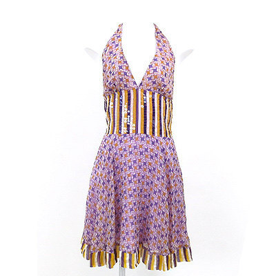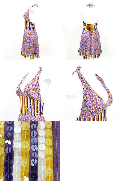 | 黄色と紫の鮮やかなお色目が見た目にも楽しい、ピンコのワンピースが 入荷致しました。 胸元と裾部分のストライプの上にはキラキラのスパンコールをあしらい とても華やか☆ ちょっとしたパーティーにも重宝しそうですね! サイドはワイヤー入りです。 着丈(バック後ろ中央より)約60㎝ バスト約64㎝ 【サイズ】:(42) 【素 材】:(表地 COTTON 60% SILK 40% 裏地 VISCOSE 100% ) 【 色 】:(黄紫) 【程 度】:(A) 20110725-033 299 031 | ||||