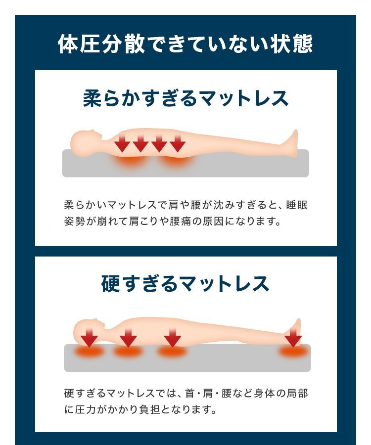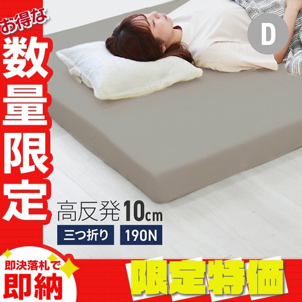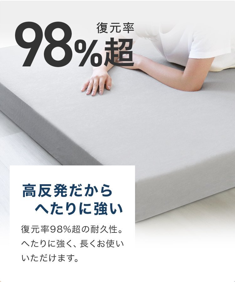 適度な硬さで身体をしっかり支える、三つ折りタイプの高反発マットレスです。 柔らかいマットレスとは違い、身体の沈み込みを軽減した腰に優しい寝心地です。 高反発マットレスのウレタンフォームは弾性が高く、適度な硬さで身体を支えるので、 底つき感もなくへたりにくいマットレスです。 寝返りが多い方や仰向けに寝ることが多い方におススメです。 簡単にたためる三つ折りタイプなので、お部屋で立て置きして 日当たりのいい場所で部屋干しが可能! 簡単着脱!洗えるU字ファスナーカバ付きです♪ 【商品仕様】 カラー:ホワイトグレージュ サイズ(約):195cm×140cm×10cm(ダブルサイズ) 折りたたみ時:(約)65cm×140cm×30cm 重量(約):8.3kg 素材:高反発ウレタン 、パイル生地 他 硬さ:190ニュートン ※耐熱仕様ではございませんので、電気毛布との併用はおやめください。 |