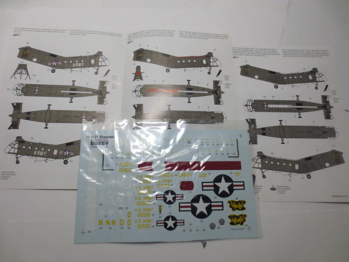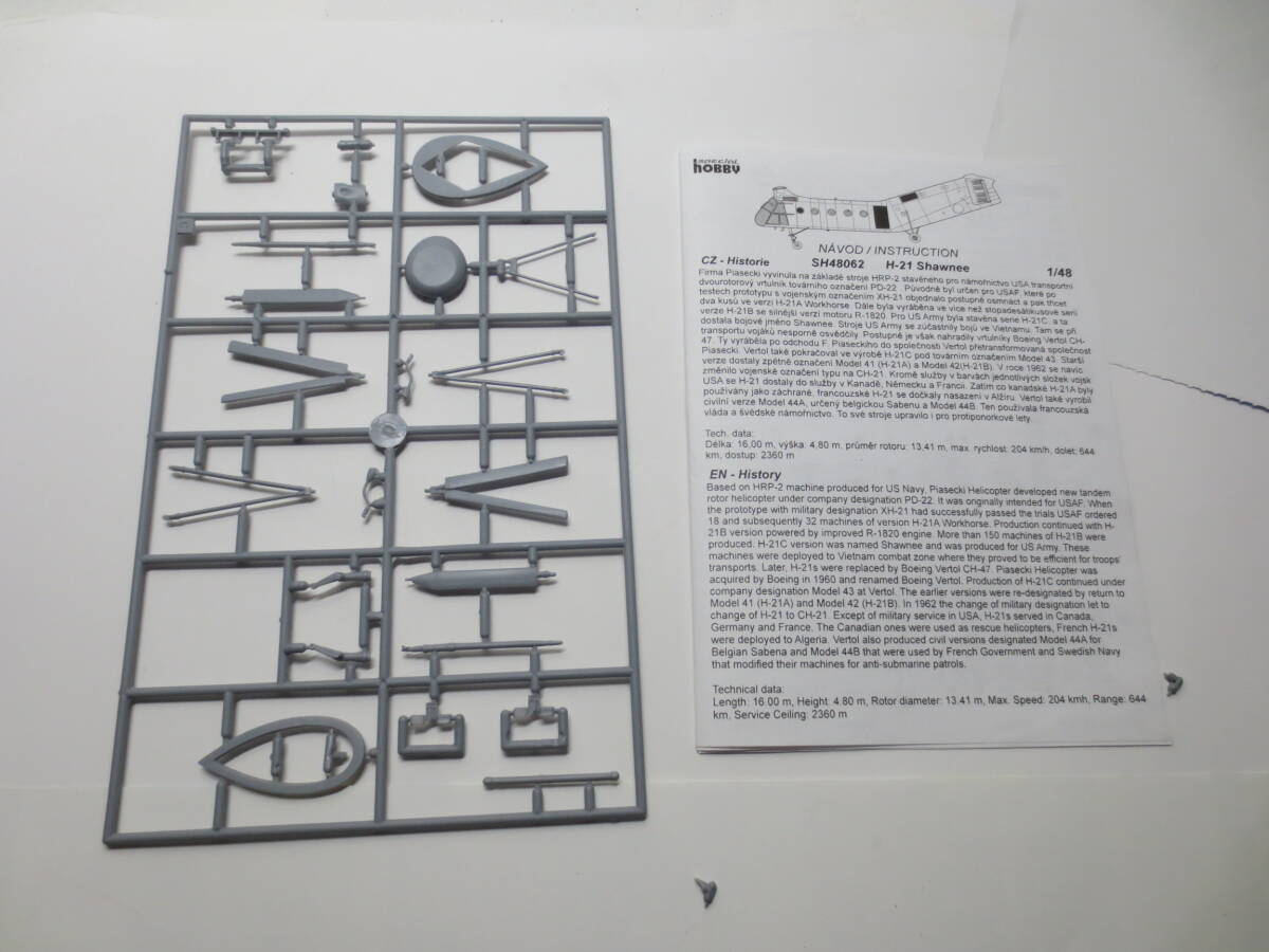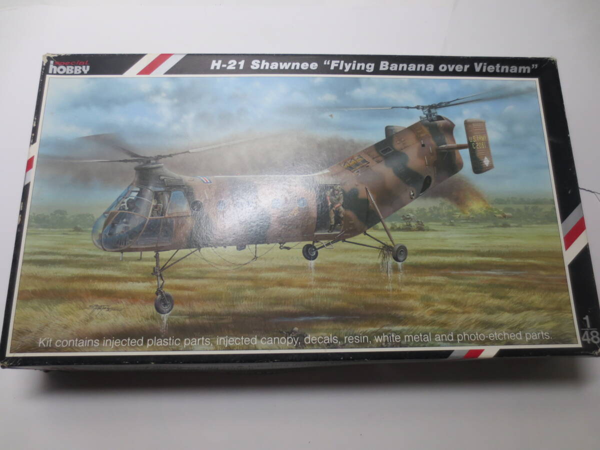 | ○ スペシャルホビー H-21 ショーニー ”フライングバナナ” 1/48の キットです。 ○中袋は開封して写真を撮りました、エッチングパーツも付いています。 | |