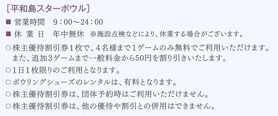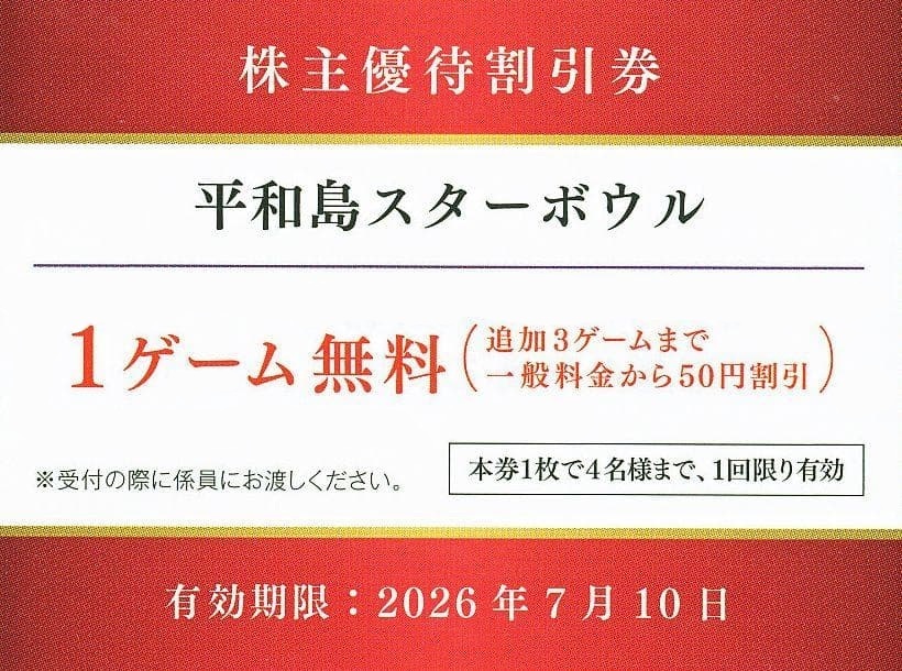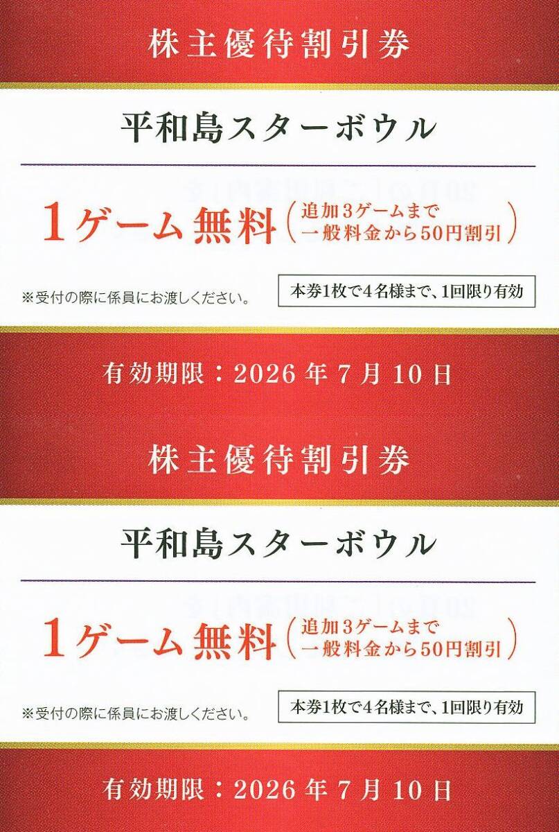 平和島スターボウル ボウリング 1ゲーム 無料券 2枚セット有効期限:2026年7月10日6組あります。まとめて購入すると、送料分がお得です。平和島スターボウルでボウリングをプレイされる方に、とてもお得な無料券です。1ゲームが無料になります。1枚で、4名様まで、ご利用いただけるようです。