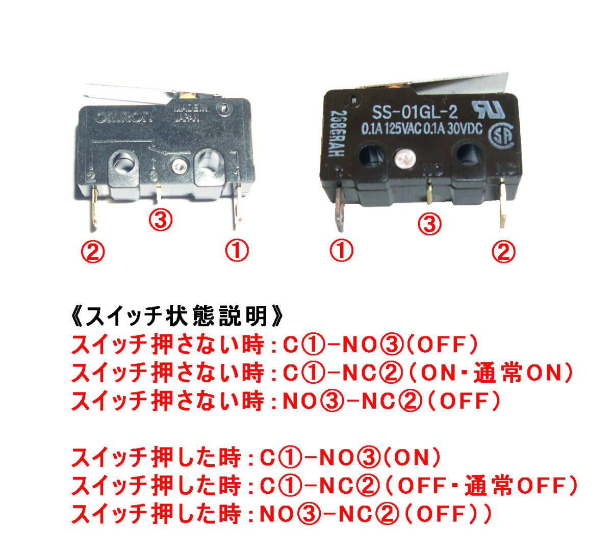 COM①とNC②が常時ONタイプのマイクロスイッチです。